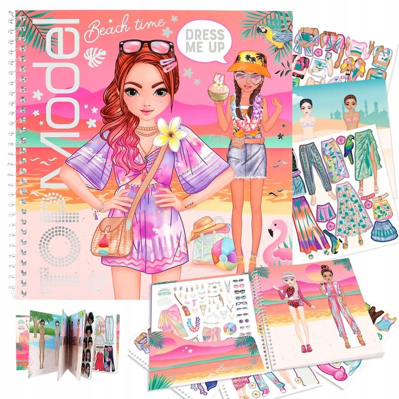 Время крутых пляжных нарядов: в спиральной книге наклеек TOPModel Dress Me Up Beach time речь идет о стильных праздничных нарядах. 24 красочно иллюстрированных фоновых страницы с фигурками моделей, которые можно бесплатно оформить наклейками для одежды и аксессуаров из 11 листов наклеек.