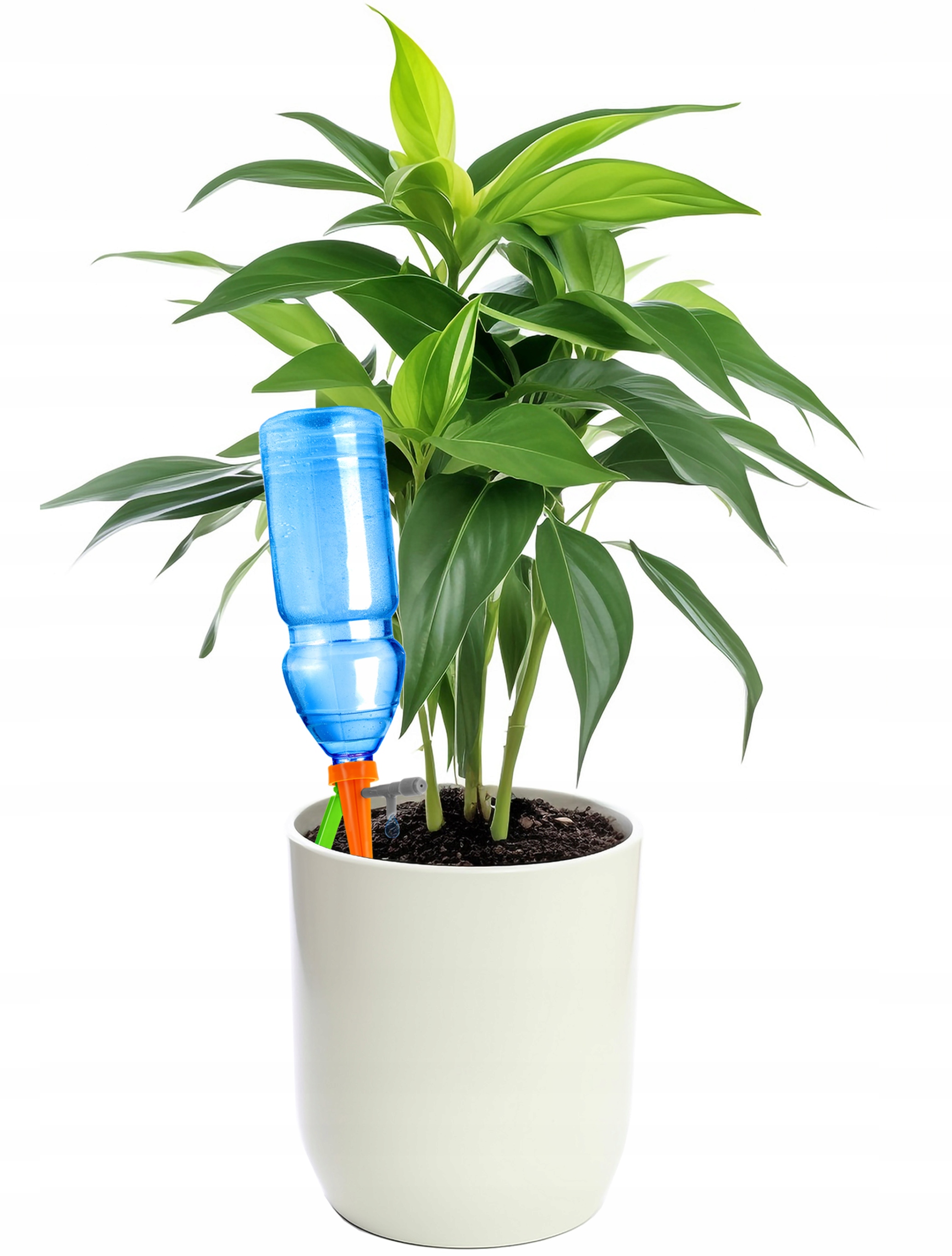 Поилку следует вдавить в резьбу пластиковой бутылки, наполненной водой, и вставить кончиком в землю внутри горшка.