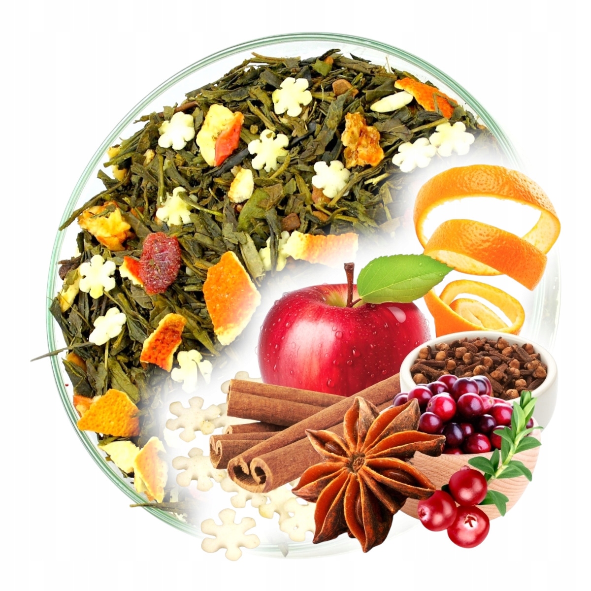 - Зеленый белый рождественский чай (50 г), ингредиенты внизу, этикетка с информацией на оборотной стороне,