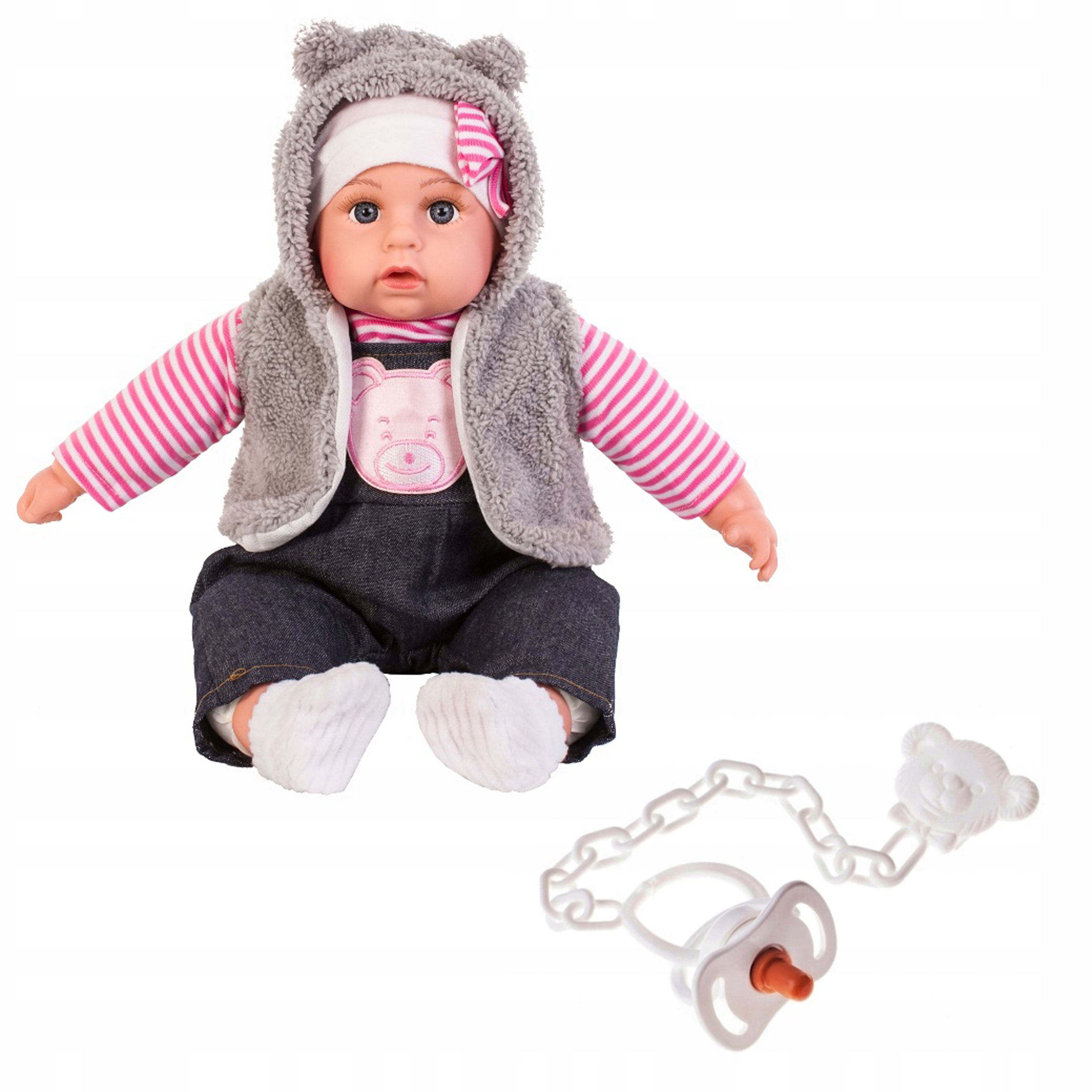Голова, руки и ноги изготовлены из мягкой резины. , прикрепленный к набивному мягкому туловищу. После нажатия на живот ребенок говорит и поет по-польски. Кукла изготовлена с особой тщательностью из очень качественных материалов. Кукла не стоит одна.