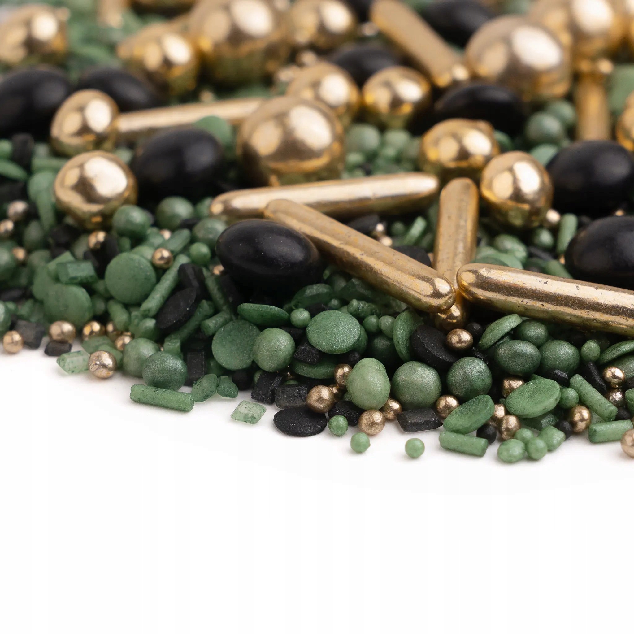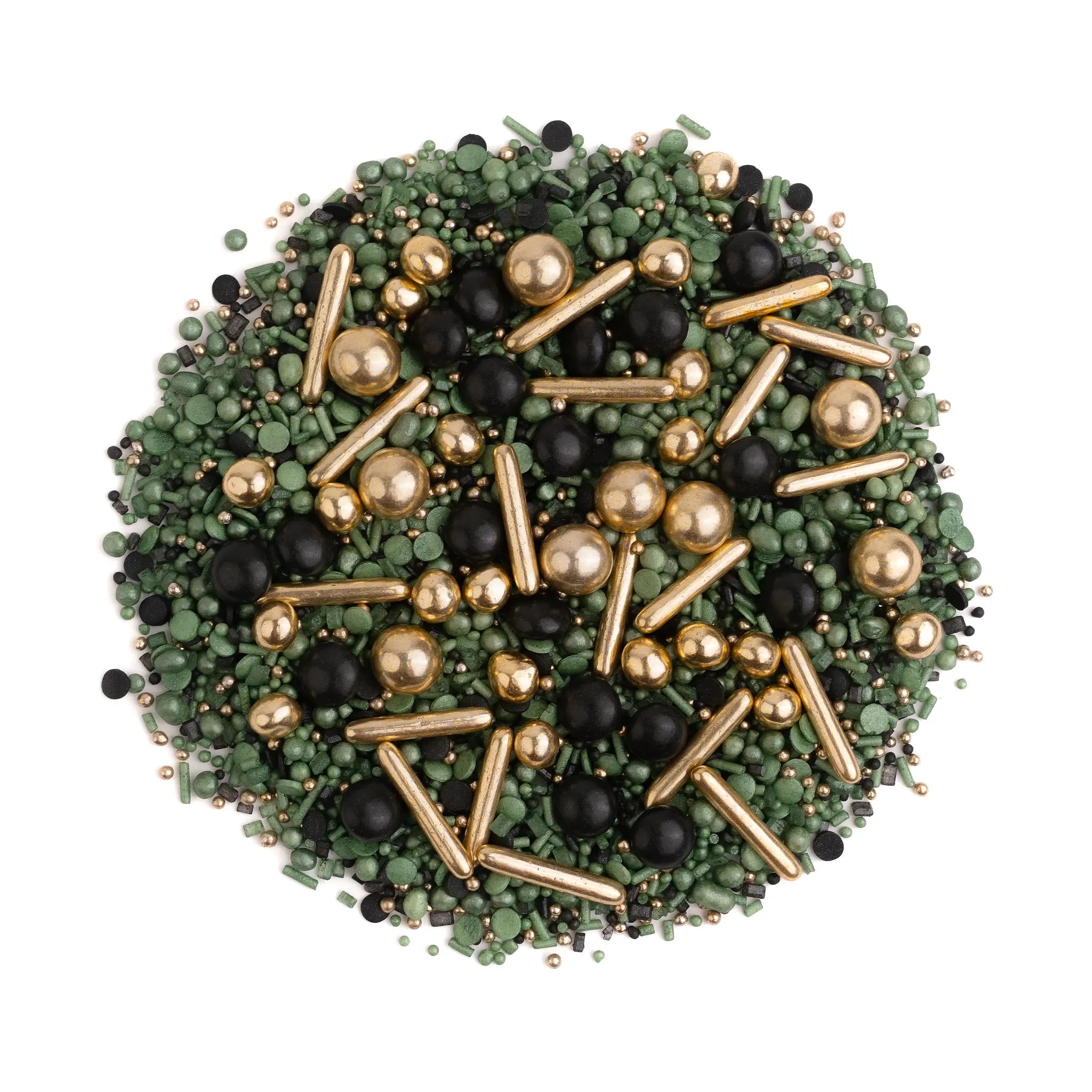 Очень элегантный микс в темных оттенках грязно-зеленого и черного цвета, подчеркнутый миндальным печеньем и шоколадными шариками с восхитительной хрустящей серединкой цвета блестящего золота. MOODY GREEN эффектно украсит сдержанные мужские торты или шоколадные десерты. Вы также можете успешно посыпать этой смесью всю осеннюю выпечку. Они станут еще более ностальгическими!