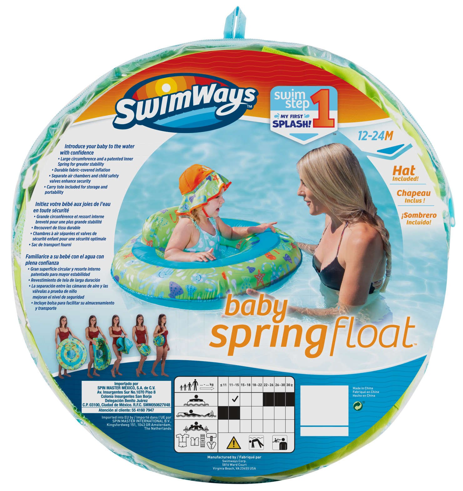Кольцо SwimWays Baby Springfloat произведено компанией Spin Master, известной своей высококачественной продукцией. Понтон имеет сиденье из сетки с отверстиями для ног и спинку, которая обеспечит комфорт ребенка. Он зеленого и оранжевого цвета и имеет изображения, связанные с морскими существами. Кроме того, в комплект входит шляпа для защиты от солнца.