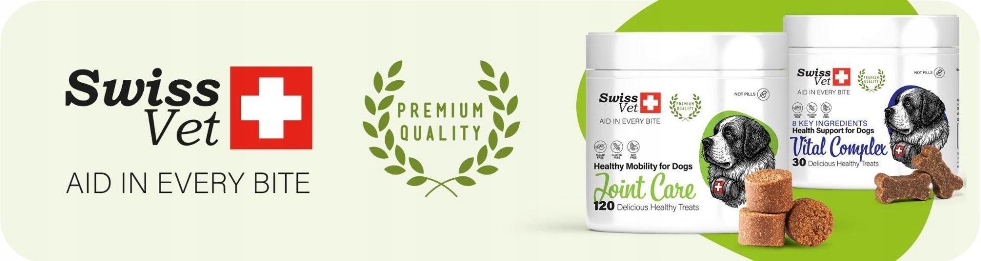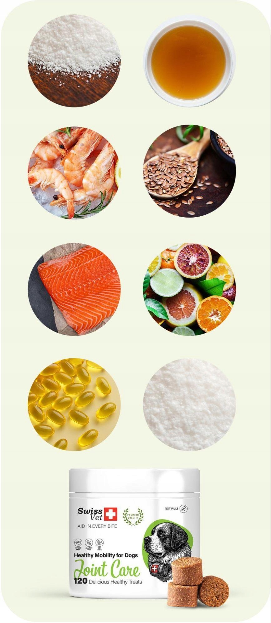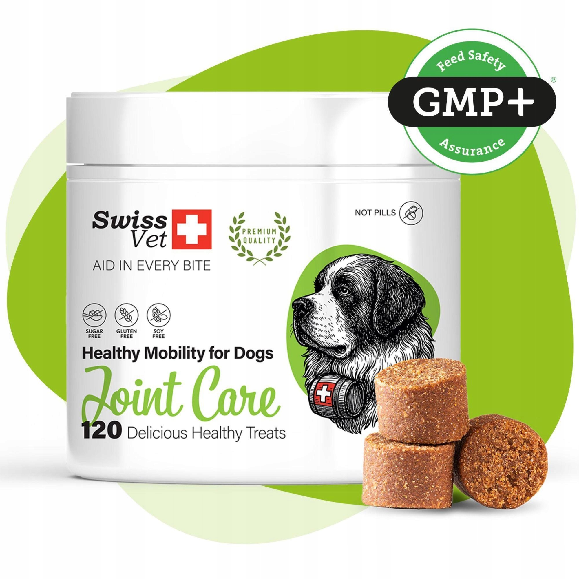 SwissVet Joint Care — это добавка для собак всех пород, которая помогает поддерживать правильное функционирование суставов. Он содержит такие ингредиенты, как глюкозамин, МСМ, коллаген и хондроитин, которые всесторонне поддерживают движение. Его формула чистая и натуральная (без ГМО, сахара и искусственных консервантов). Отличается своей формой - имеет вид вкусных мягких кусочков, которые охотно поедаются собаками :)