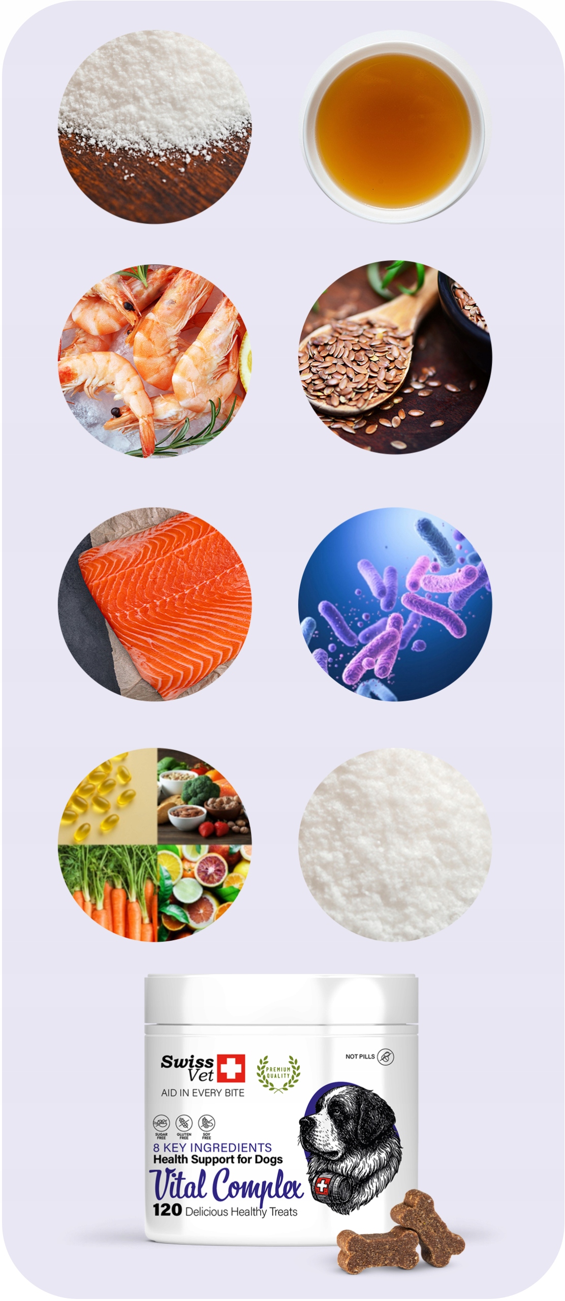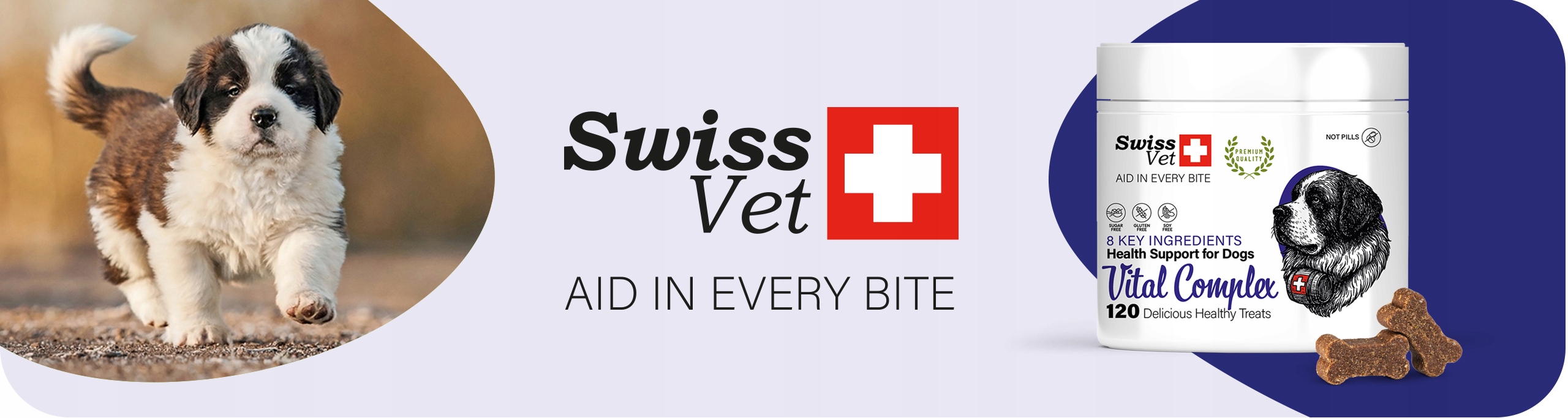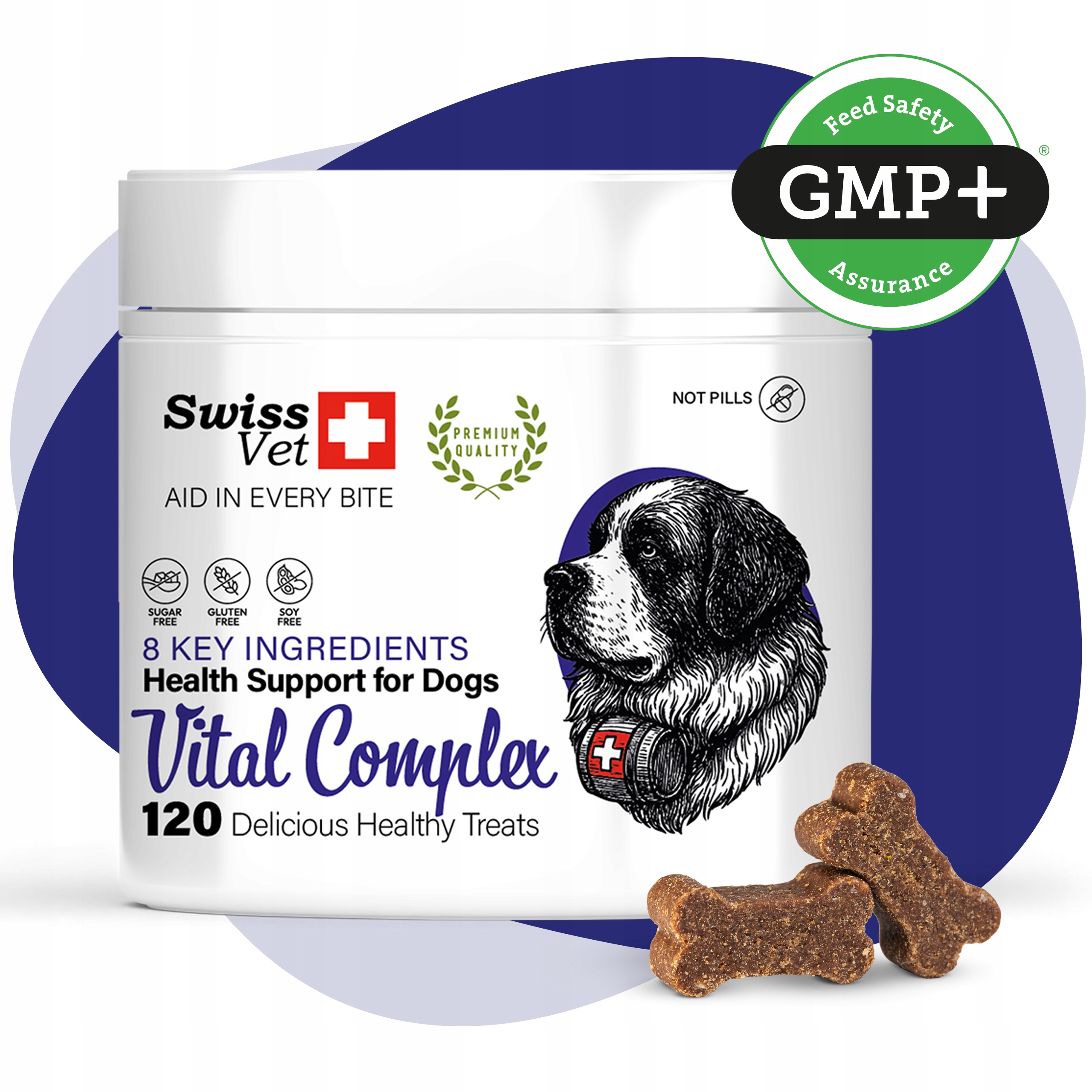SwissVet Vital Complex - это добавка для собак всех пород, которая помогает поддерживать ежедневный жизненный тонус. Он содержит такие ингредиенты, как глюкозамин, МСМ, коллаген, пробиотики и хондроитин, которые комплексно поддерживают хорошее самочувствие, иммунитет, обмен веществ и здоровье суставов, кожи и шерсти. Его формула чистая и натуральная (без ГМО, сахара и искусственных консервантов). Отличается своей формой - имеет вид вкусных мягких кусочков, которые охотно поедаются собаками :)