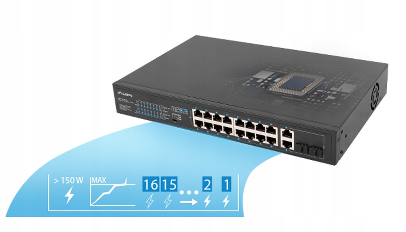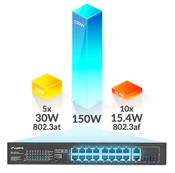 Коммутатор оснащен в общей сложности 18 портами, включая 16 портов PoE+ (Fast Ethernet) и 2 Uplink (Combo Gigabit). Продуманная конструкция и внимание к качеству комплектующих обеспечивают пользователю до 150 Вт суммарной реальной мощности для конечных устройств, а значит возможность для одновременного подключения: