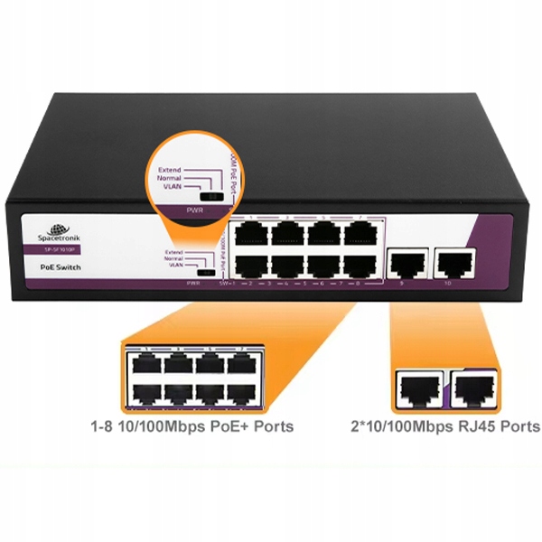 ⭐ 10-портовый коммутатор Spacetronik SWITCH 8 портов POE + 2 порта Uplink Ethernet RJ45 SP-SF1010P 10/100 Мбит/с, 120 Вт ⭐