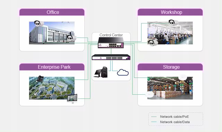 Power over Ethernet (сокращенно PoE) — это технология передачи энергии по кабелю Ethernet. Благодаря этому мы можем одновременно питать устройство и обеспечивать обмен информацией. Технология PoE особенно популярна в случае IP-камер, VoIP-телефонов, точек доступа в Интернет (Access Point) и POS-терминалов. Сетевые устройства, использующие PoE, удобны в использовании, поэтому нравятся монтажникам. Возьмем в качестве примера сеть мониторинга: обычно к каждой камере необходимо проложить отдельный кабель питания и передачи данных. Здесь мы можем использовать переключатель, который одновременно будет питать устройства и отправлять с них информацию.