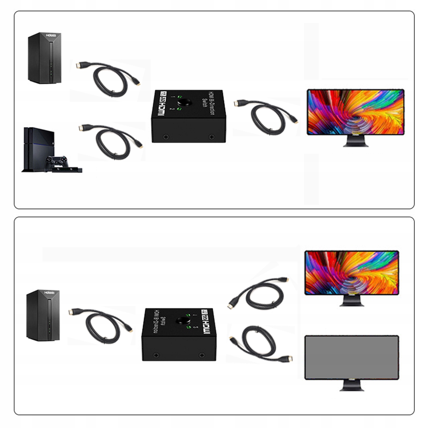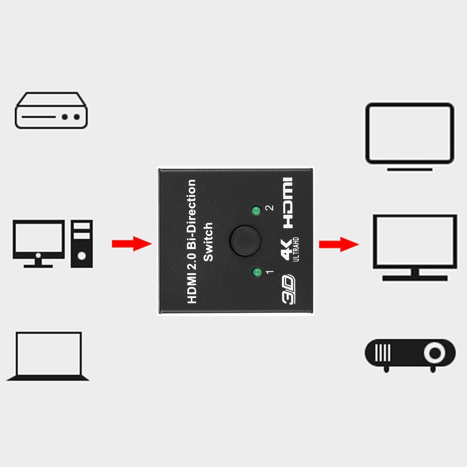 【Двунаправленный переключатель HDMI】 Этот переключатель HDMI оснащен 3 портами HDMI, поэтому вы можете подключить два источника HDMI к одному дисплею HDMI или подключить один источник HDMI для переключения между двумя дисплеями. С помощью двух светодиодных индикаторов вы можете легко увидеть, какой порт активен. Светодиодный индикатор (одновременно работает только 1 из 2 дисплеев).