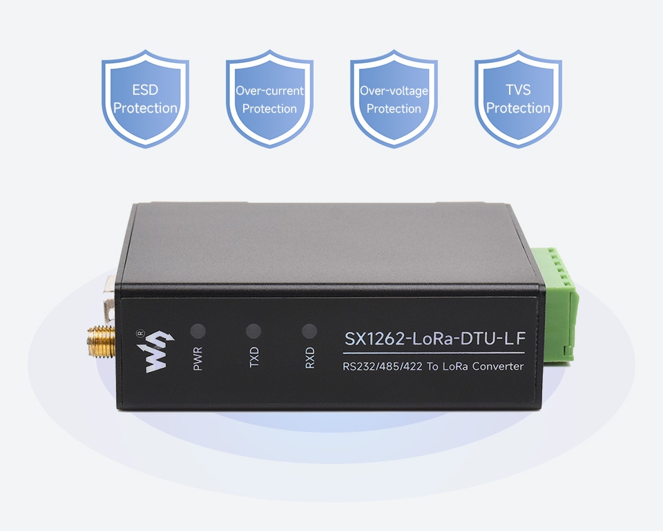 SX1262-LoRa-DTU — устройство беспроводной передачи данных с интерфейсами RS232, RS485 и RS422 на базе модуля SX1262. Принимает технологию модуляции и демодуляции LoRa с преимуществами защиты от помех и связи на больших расстояниях (до 5 км). Поддерживает соединение «точка-точка», «точка-множество точек», ретрансляционная сеть, AES и т. д. Компактный размер и простота установки, подходит для беспроводной передачи данных и управления устройствами промышленного стандарта или нестандартного пользовательского протокола.- Принимает технологию модуляции и демодуляции LoRa, защиту от помех и связь на большие расстояния.