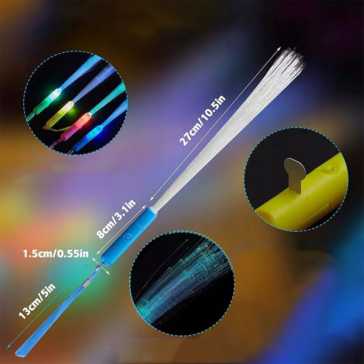 Эти световые палочки выполняют три функции при трехкратном нажатии кнопки: быстрое мигание, медленное мигание и постоянное свечение. Кроме того, светящиеся палочки поочередно мигают 7 цветами (желтый/зеленый/синий/фиолетовый/красный/белый/розовый). Он наносится слой за слоем так, что при включении весь стик начинает светиться.
