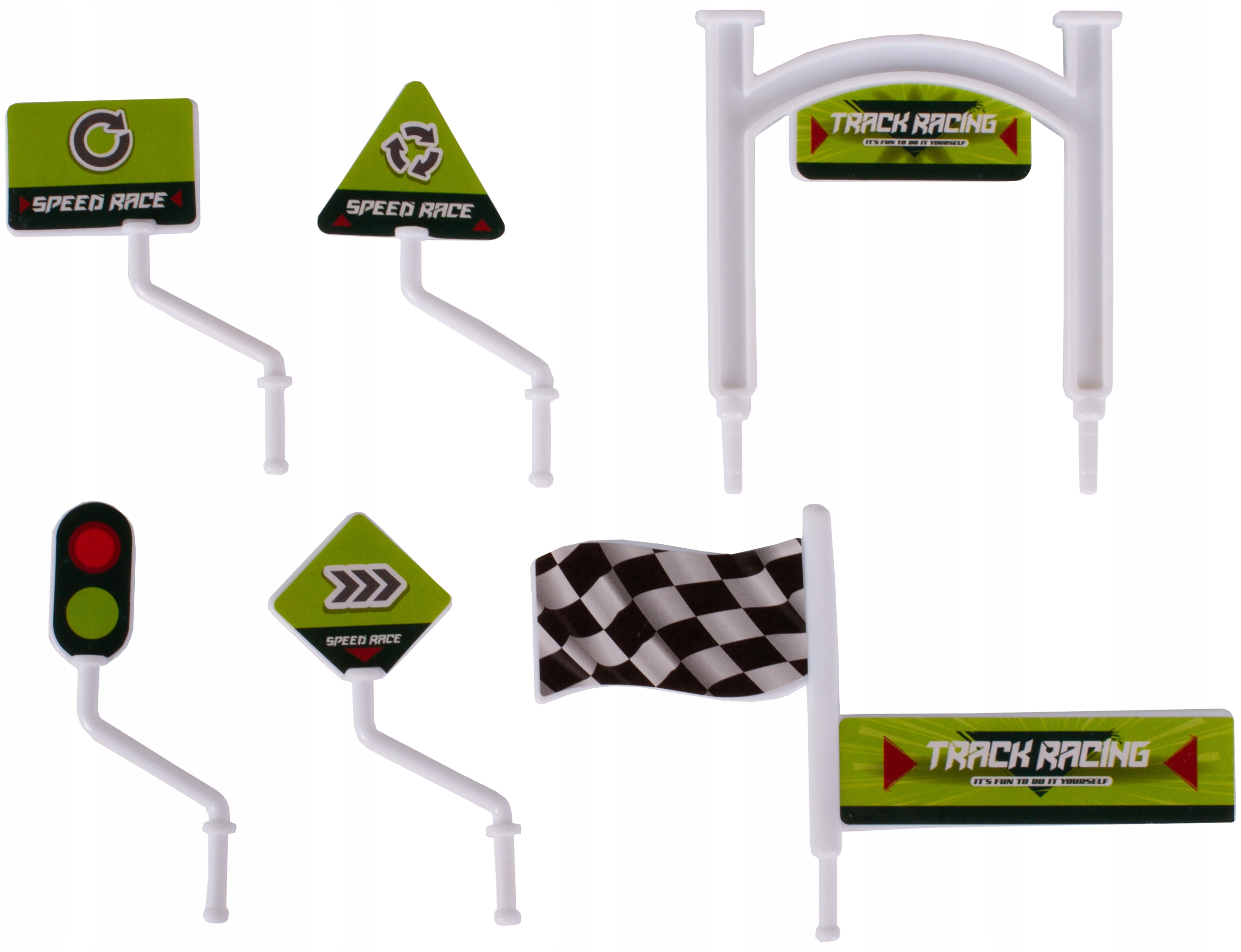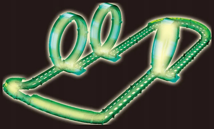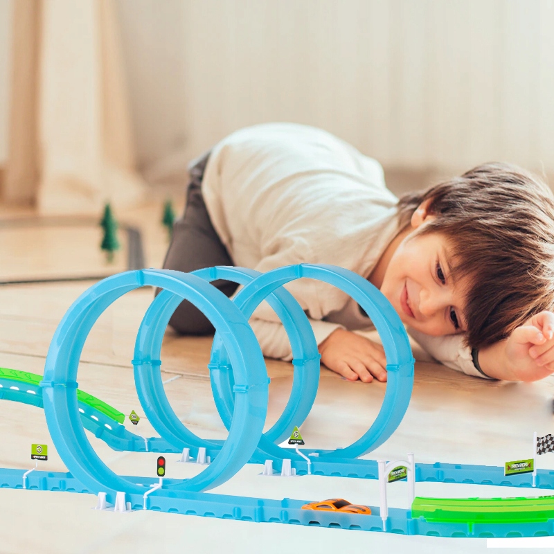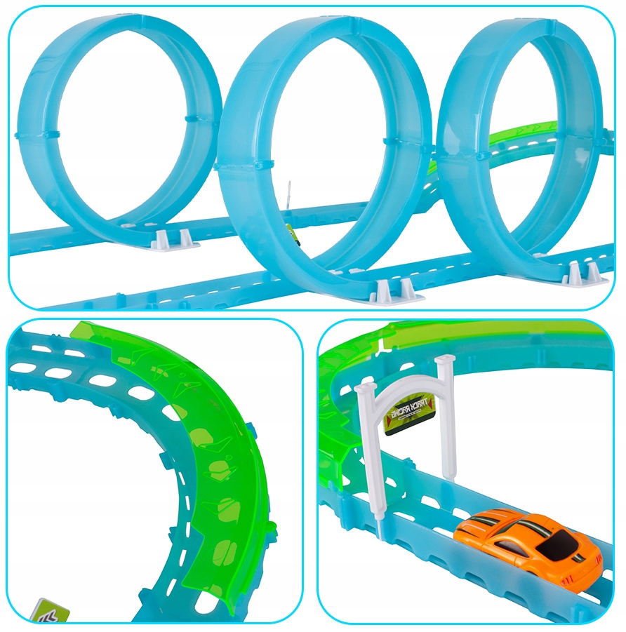 Автомобильная трасса имеет быстрый и привлекательный маршрут с тремя кругами на 360° и двумя быстрыми поворотами на 180°. По углам имеются специальные накладки, предотвращающие падение автомобиля с трассы.