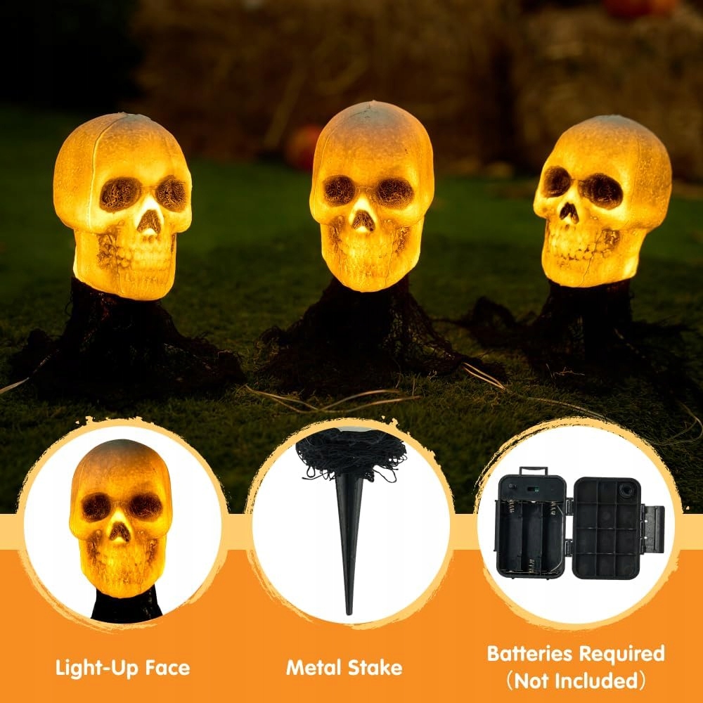 - Комплект: 3 светящихся светодиодных черепа.