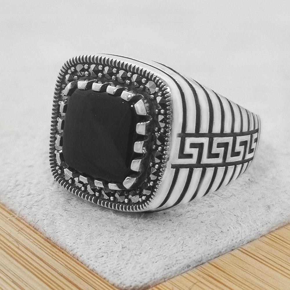 Серебряный мужской перстень-печатка с квадратным реконструированным ониксом 1,0 см х 1,0 см, окруженным марказитами. Изготовлено с особой тщательностью и вниманием к деталям. Кольцо с печаткой окислено, поэтому оно будет оставаться как новое долгие годы.