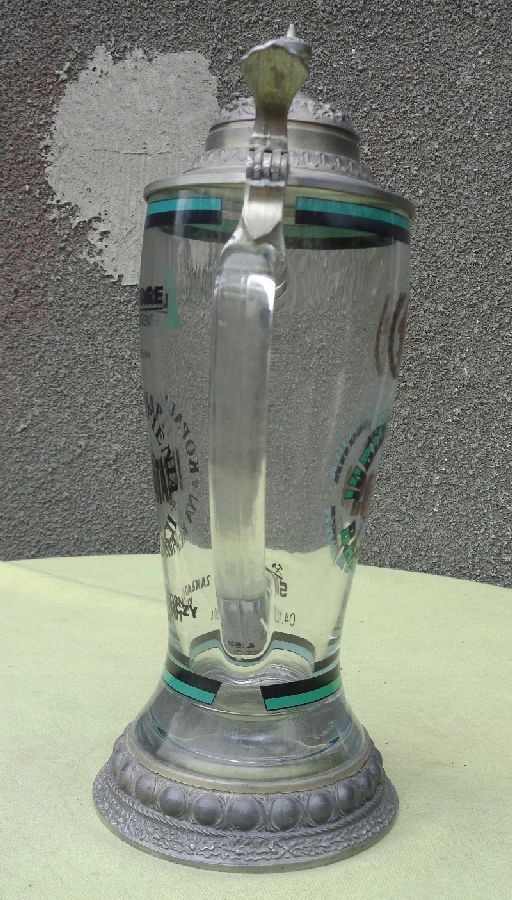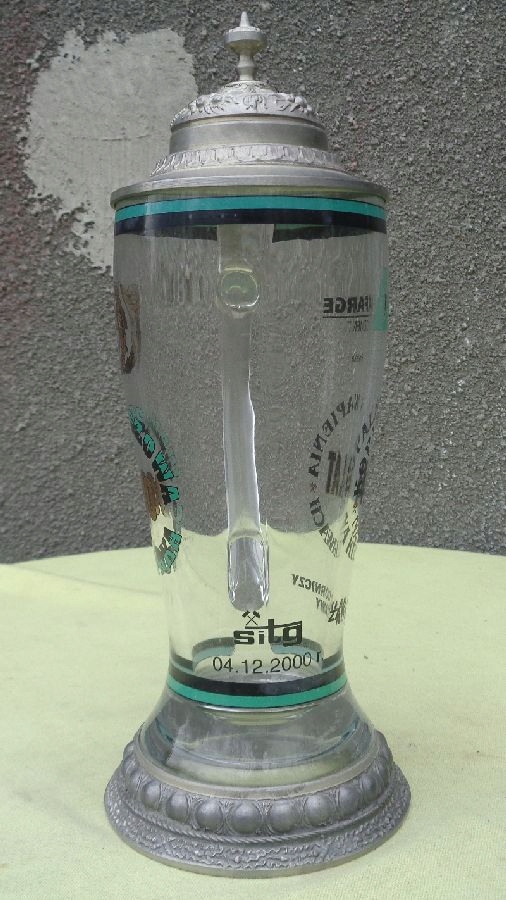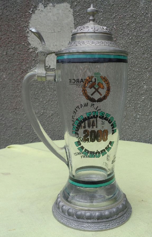 Красивая, элегантная стеклянная кружка 2000 года выпуска. Экспонат сделан в 2000 году ко Дню Святой Марии. На кружке надпись, сообщающая, сколько лет работает завод. На кружке также имеется логотип компании и дата юбилея. Кружка имеет необычную форму и форму. Крышка кружки изготовлена из жести и украшена красивым, богатым орнаментом. Дно кружки имеет красивый, богатый абажур из жести. Кружка не имеет повреждений и дефектов. Экспонат подписан, подпись видна на фотографиях. Всем рекомендую.