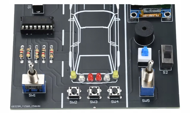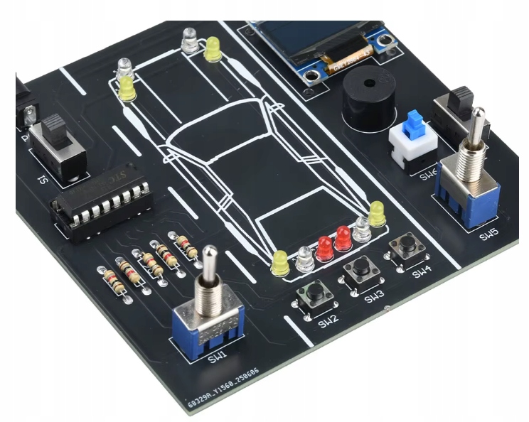 Изделие выполнено на основе высококачественной печатной платы (PCB) размерами 100 х 100 мм с понятным описанием, облегчающим установку сквозных элементов (THT). Тренажер оснащен цифровым ЖК дисплеем, выполняющим функции спидометра (показания до 180 км/ч) и указателя направления движения. Система реалистично имитирует полное освещение автомобиля: независимые указатели поворота (левый/правый), аварийную световую сигнализацию, ближний свет, стоп-сигналы с функцией торможения и фонари заднего хода. Дополнительным преимуществом является встроенный зуммер, имитирующий звук звукового сигнала, что увеличивает погружение во время использования.