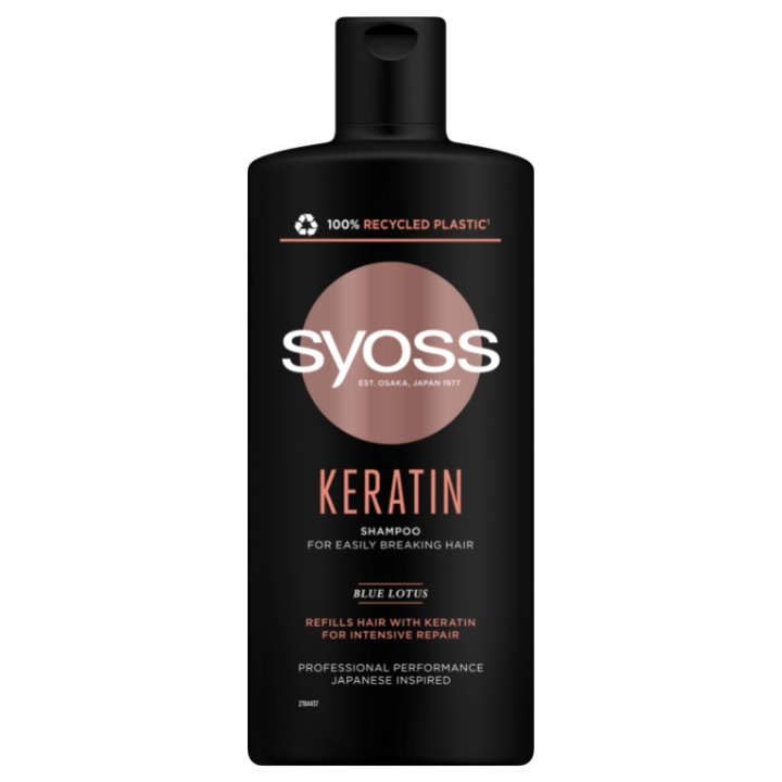 В японском стиле Шампунь Syoss Keratin с цветком голубого лотоса для ломких волос.