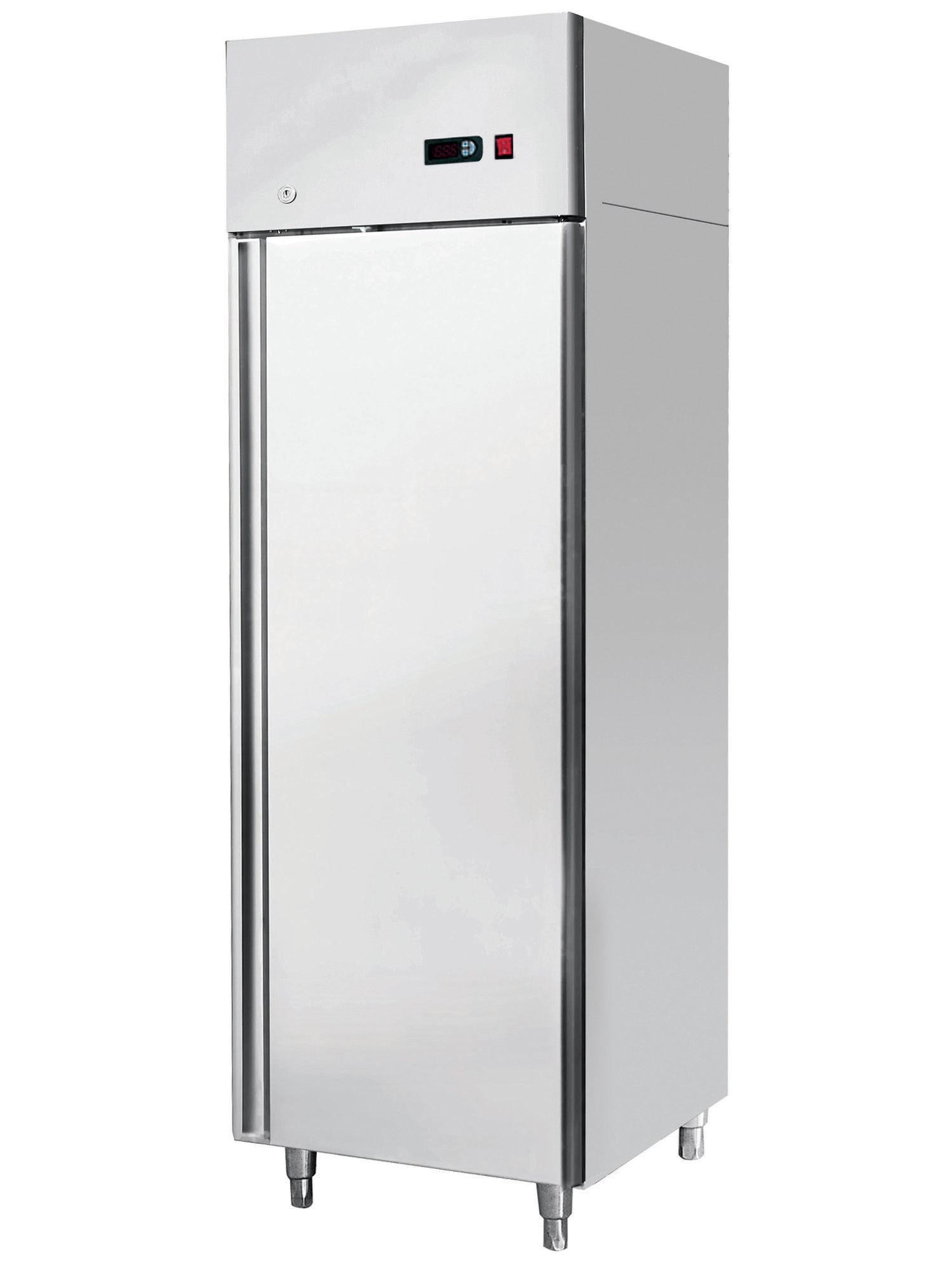 Гастрономический холодильный шкаф вместимостью 670 литров полезной емкости с верхним агрегатом, адаптированный под гастроемкости GN 2/1. Оснащен воздушным охлаждением (принудительным вентилятором), автоматическим размораживанием и испарением конденсата. Корпус и внутренняя часть шкафа изготовлены из нержавеющей стали.