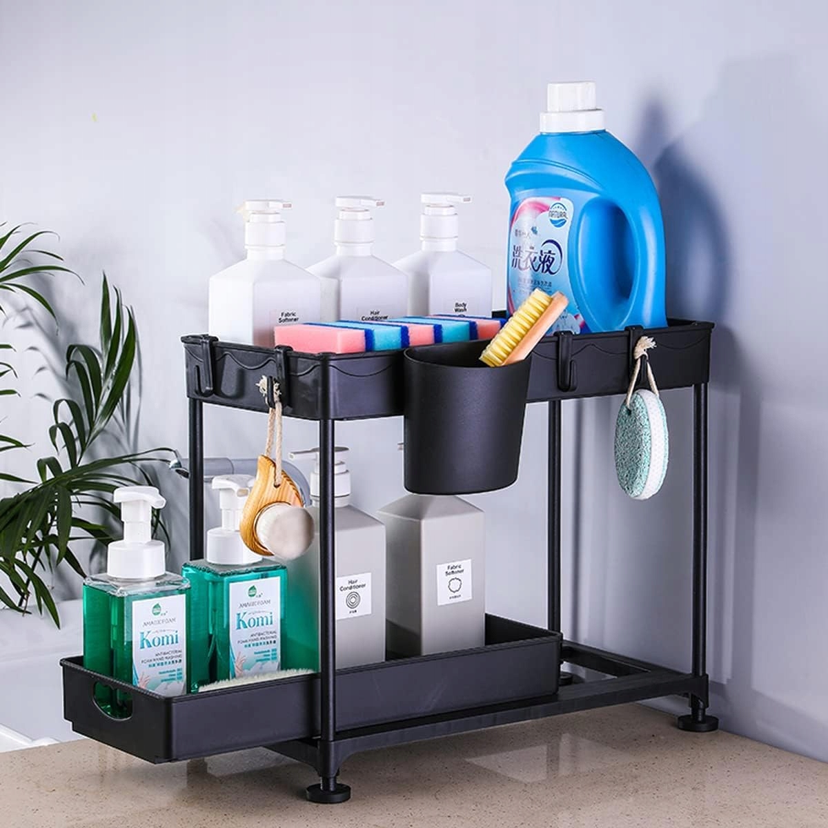 Органайзер под раковиной, выдвижная полка, двухъярусная корзина с крючками и ручкой