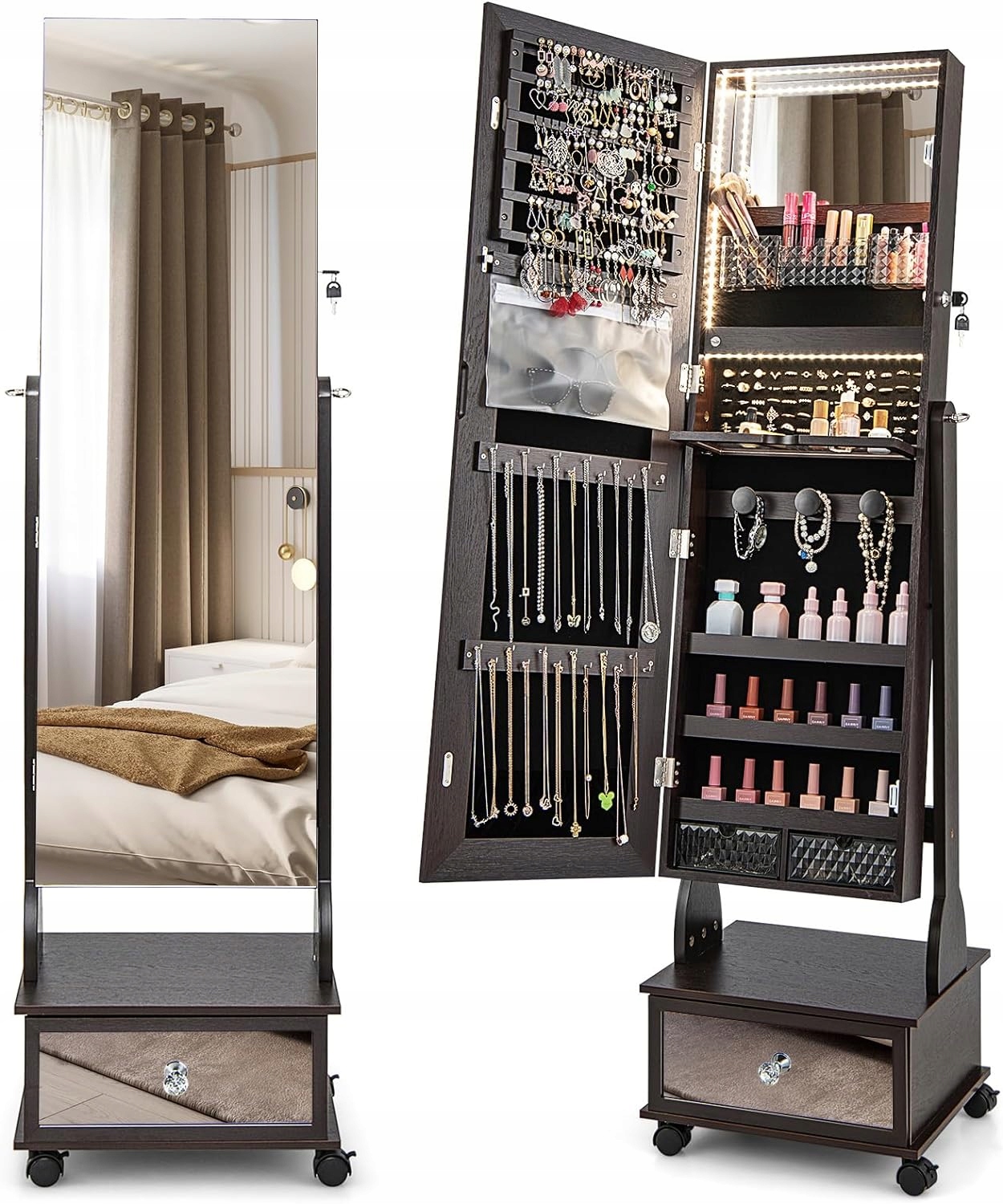 Szafka na biżuterię z lustrem, z lustrem z oświetleniem LED i szufladą