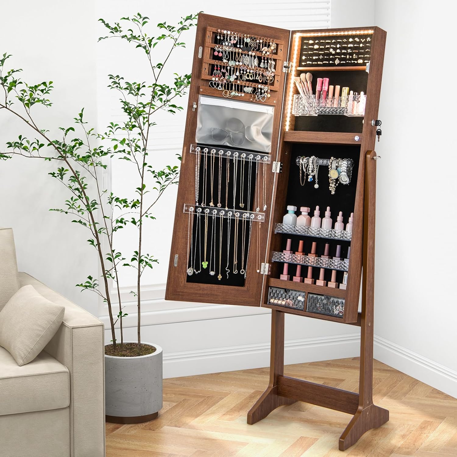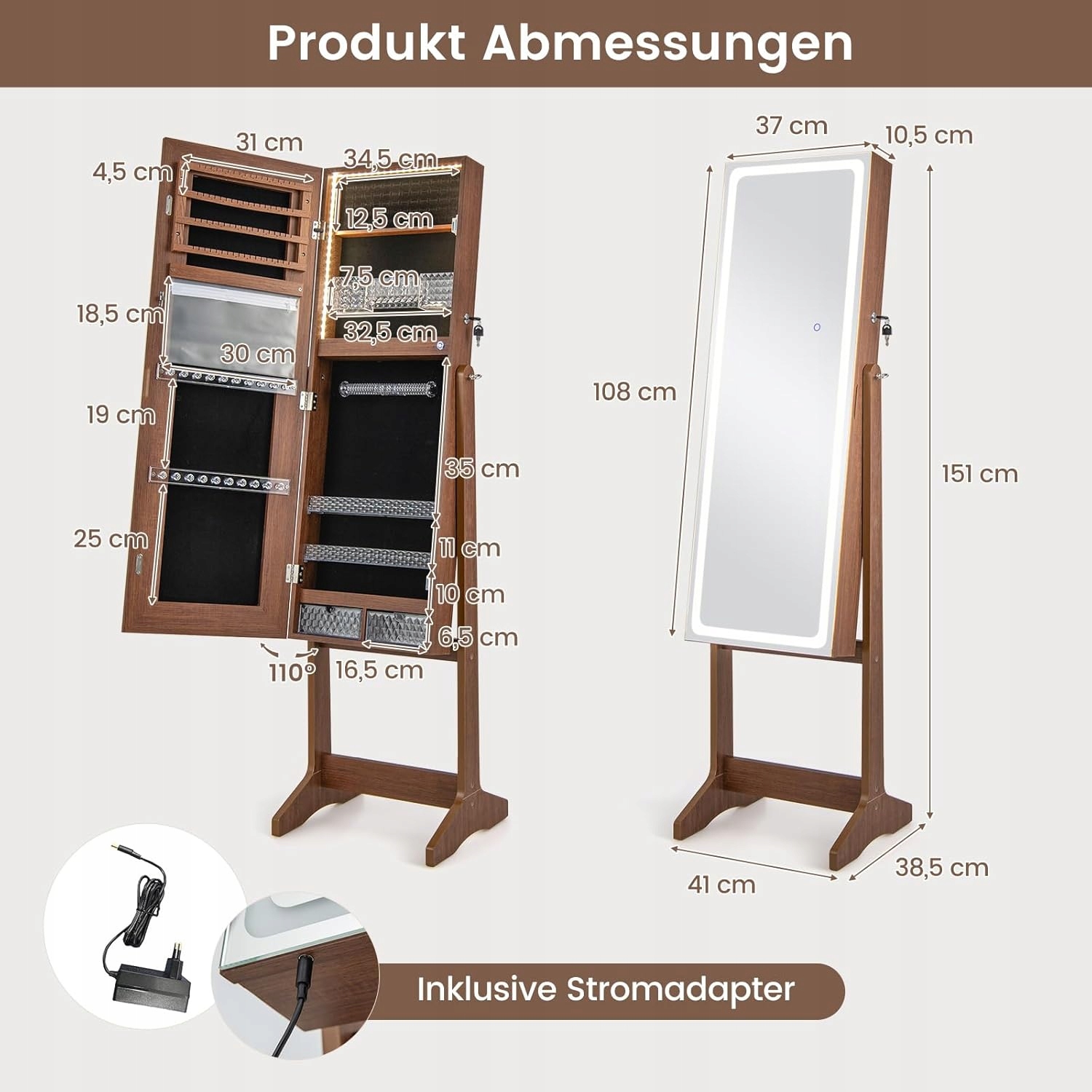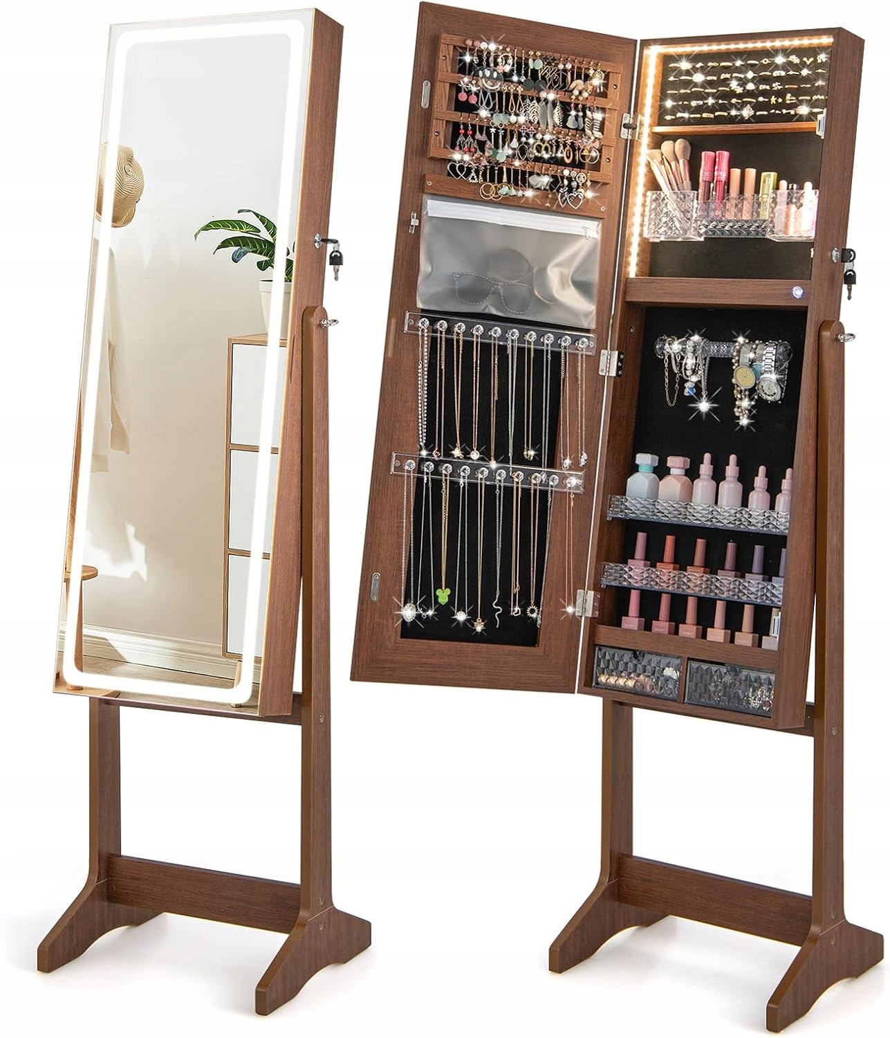 Szafka na biżuterię z lustrem i oświetleniem LED lustro na biżuterię orzech
