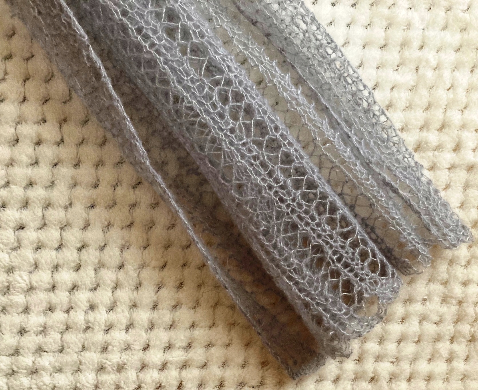 Стирать шарф вручную при температуре максимум 30°С, аккуратно отжать лишнюю воду, разложите его сушиться, слегка растягивая до нужных размеров. Гладить при низких температурах можно через ткань, соблюдая осторожность.