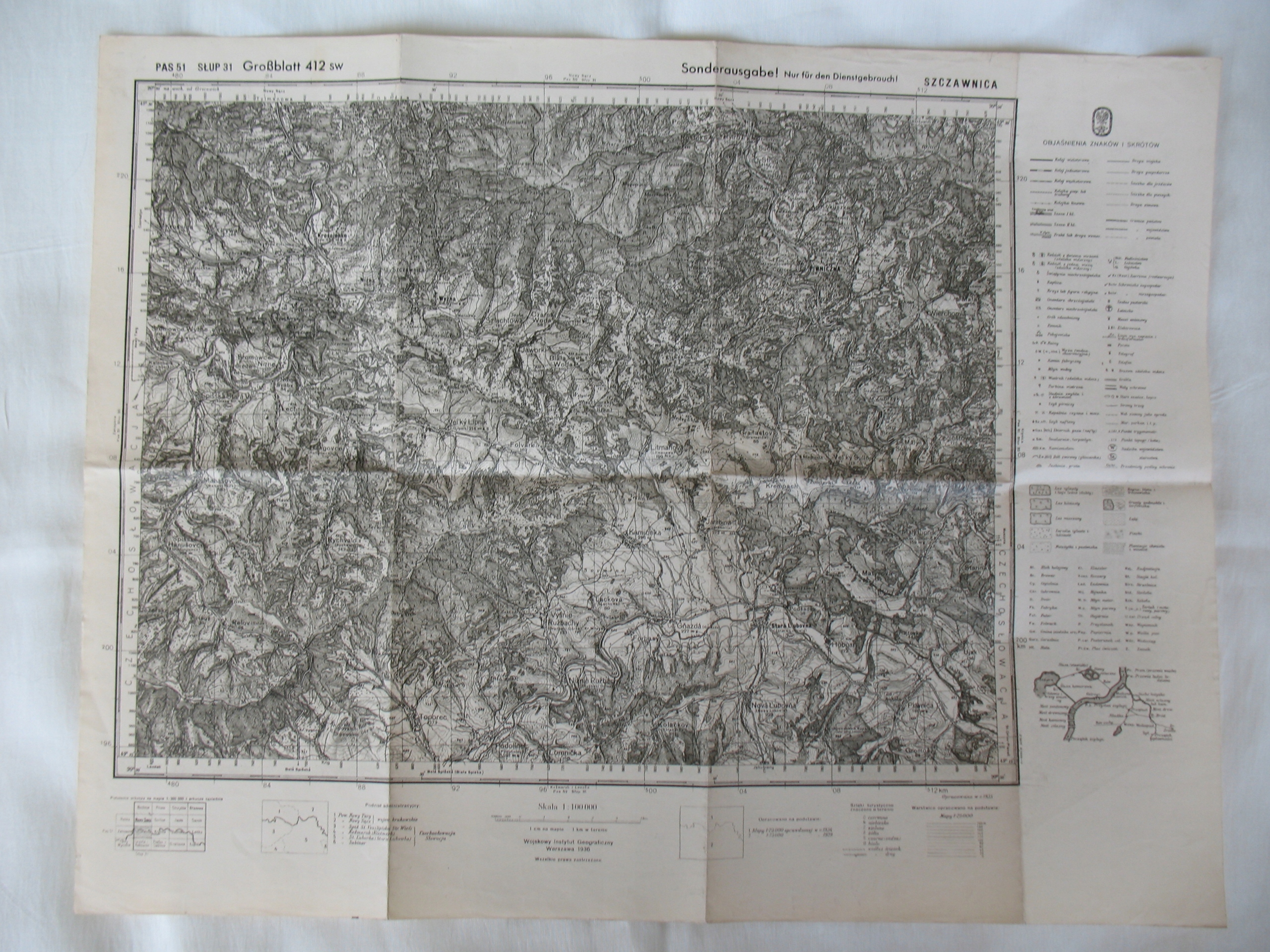 Старая оригинальная довоенная карта: Щавница и окрестности. Оригинал. Масштаб: 1:100 000. Карта фабрично сложена на 6 частей. Датировано: 1936 г. Размеры: 370 х 480 мм. Состояние: на мой взгляд: хорошее, незначительные загрязнения, заломы и перегибы, потертости на складках, все видно на сканах. Смело совершайте покупки.