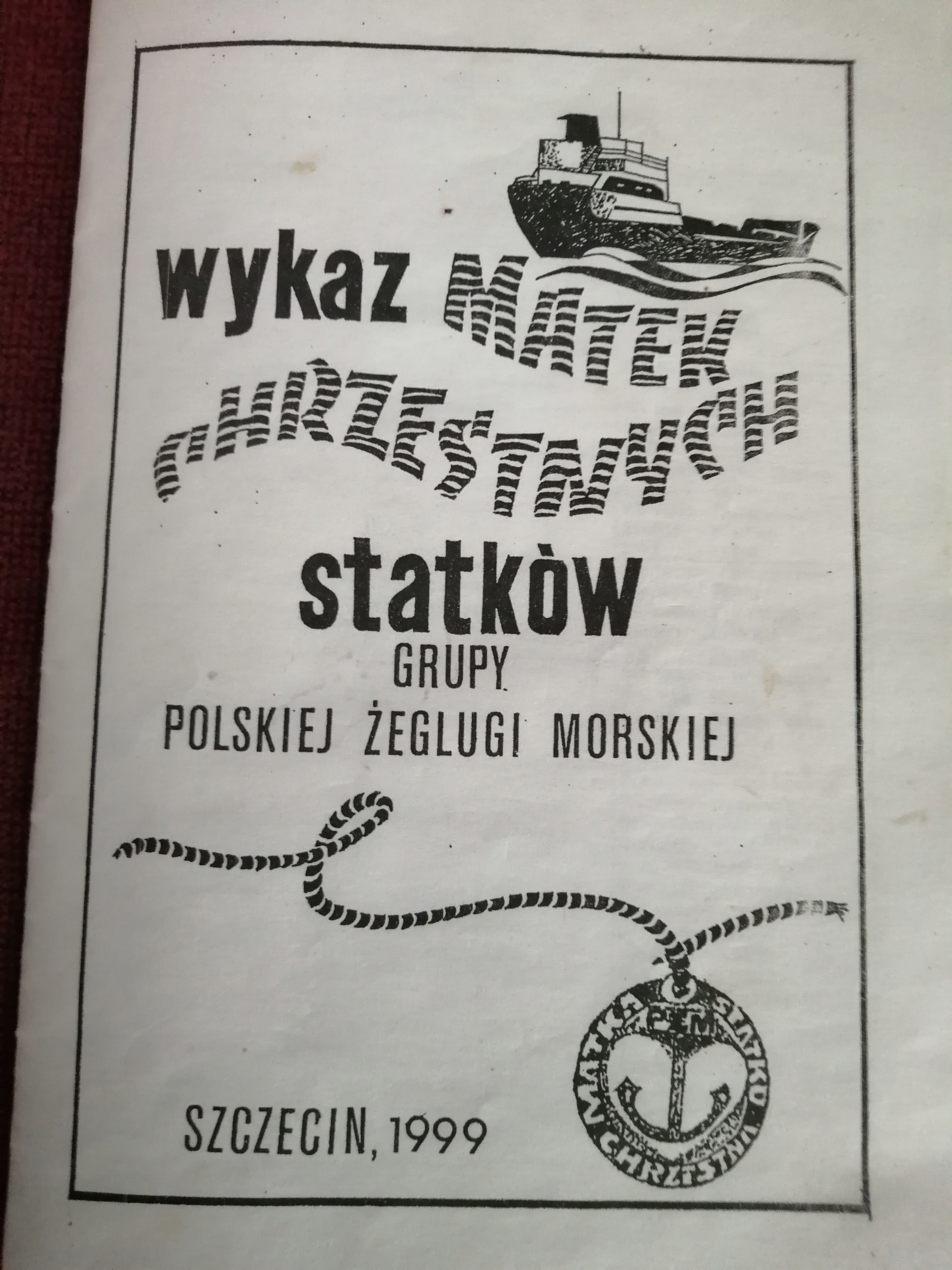 КНИГА СО СПИСКОМ КРЕСТНЫХ КОРАБЛЕЙ ГРУППЫ PŻM ЩЕЦИН 1999 ГОДА. В КНИГЕ СОДЕРЖИТ НАЗВАНИЕ СУДНА - КРЕСТНАЯ И ИНФОРМАЦИЯ О СУДНЕ - ГОД ПОСТРОЙКИ, ДАТА - ГОД ВЫВОДА. ВСЕГО 184 СОХРАНЕННЫХ СУДОВ.