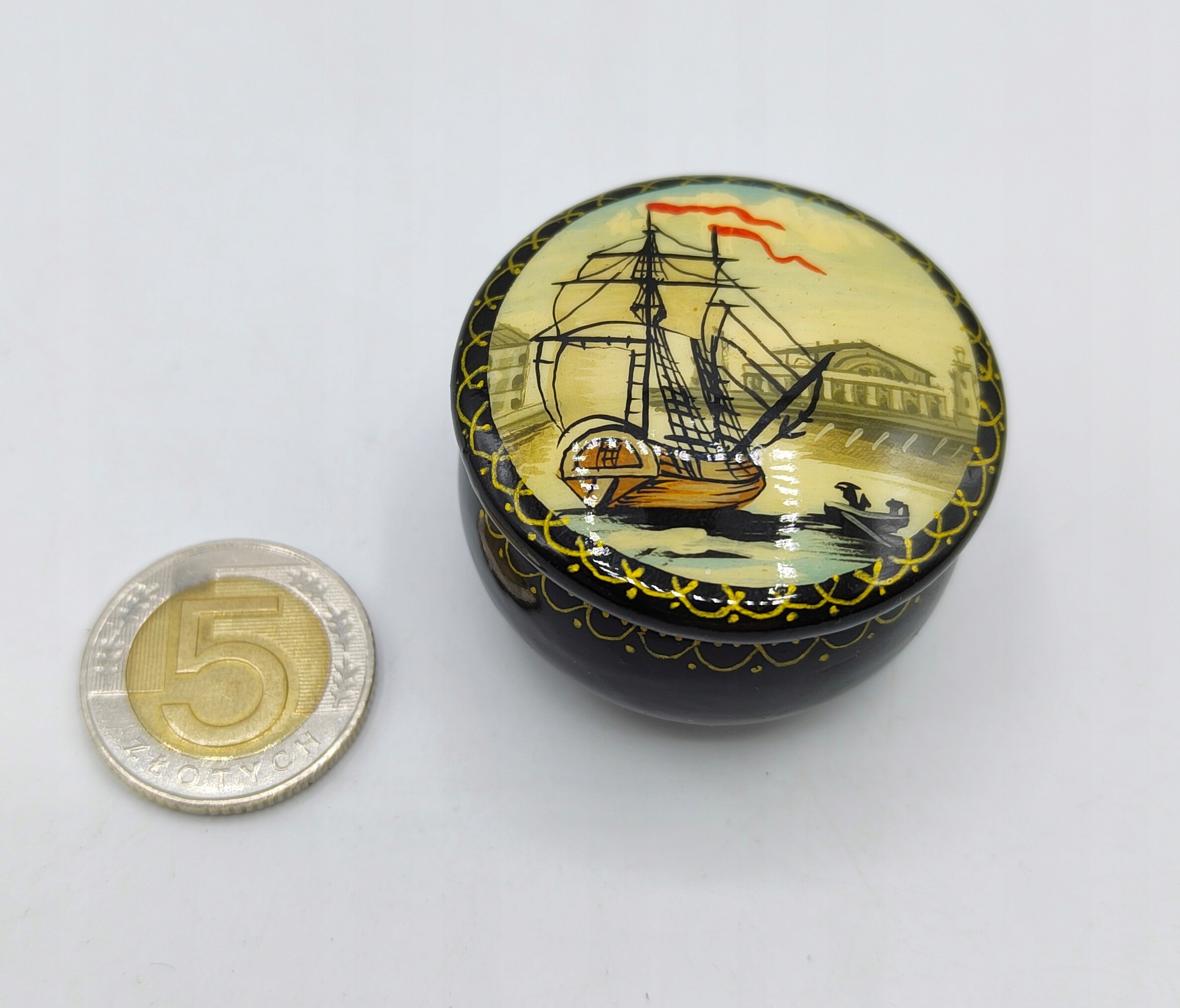 SZKATUŁA lakowana ŻAGŁOWIEC stara CYRYLICA ręczna