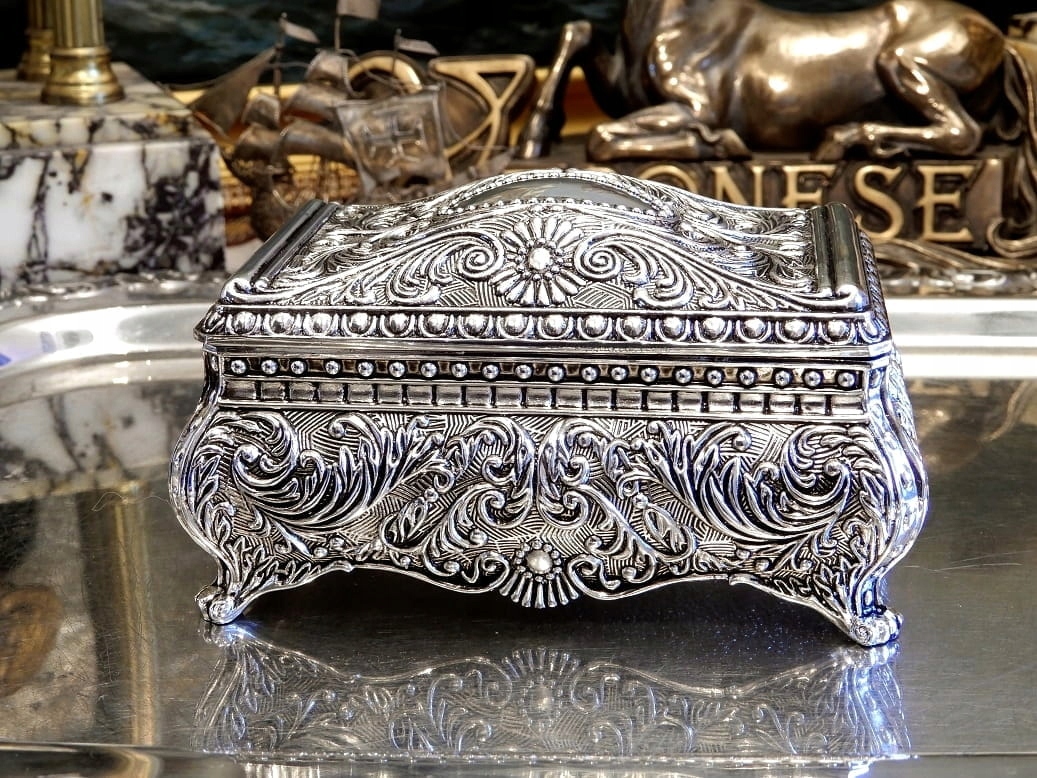 Шкатулка изготовлена из цинкового сплава, посеребрена по всей поверхности. Все. дополнительные отражения на поверхности - это отражения стоящих рядом предметов. Красивый, необычный предмет.