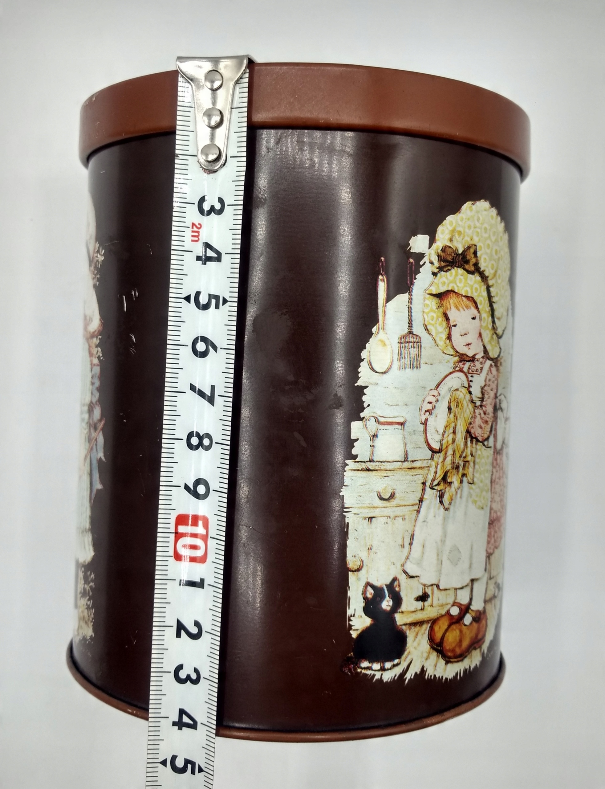 - фото №4 с подписью предмет старый и это видно, кое-где есть микровмятины, царапины, налеты коррозии, это только добавляет шарма жестяной банке , все это дополняется приятными цветами и красивым мотивом девушек с кошками и чашками,< /li>