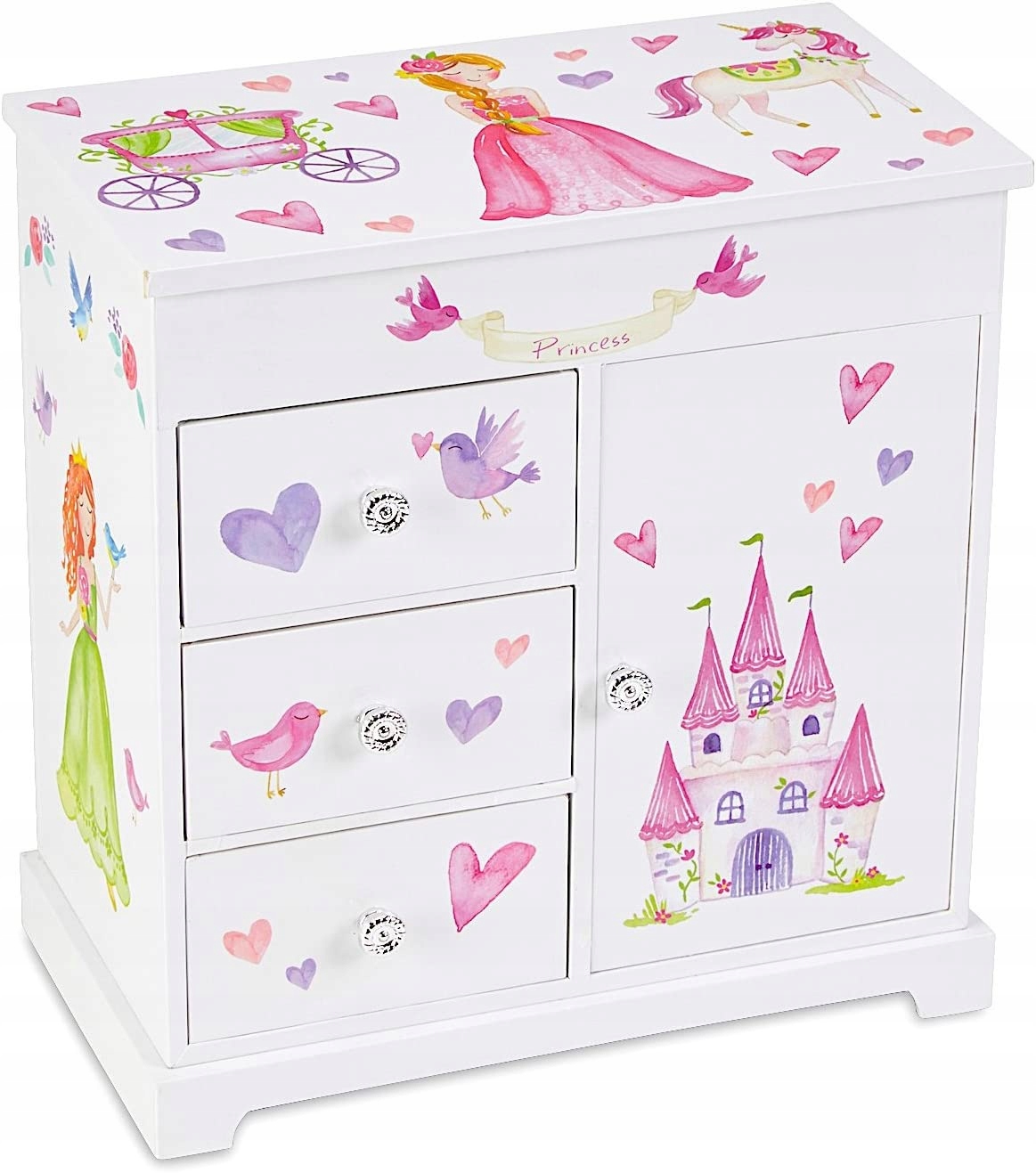 - Храните драгоценные сокровища. Наша музыкальная шкатулка сказочной принцессы позволяет легко организовать украшения для маленьких девочек. В ЧЕТЫРЕ ПРОСТОРНЫХ ЯЩИКАХ достаточно места для хранения колье, браслетов, сережек и других сувениров для девочек. Он не только поможет поддерживать порядок в вашей комнате, но и имеет гладкую нежно-розовую подкладку, которая поможет предотвратить появление царапин на безделушках вашего ребенка.