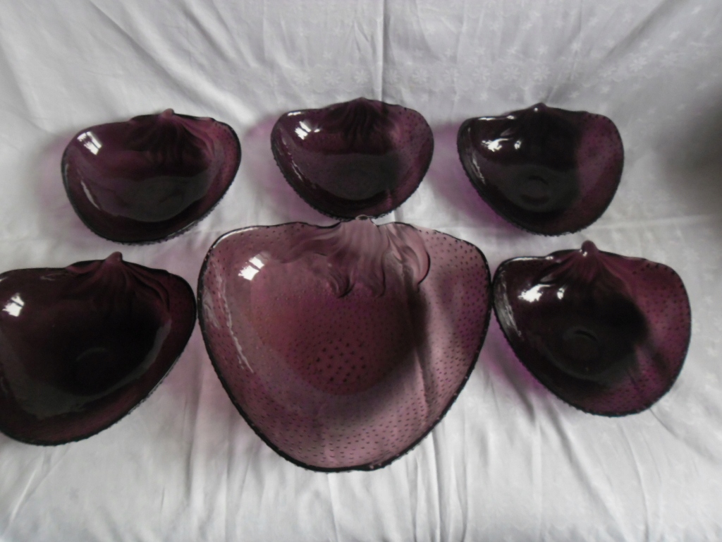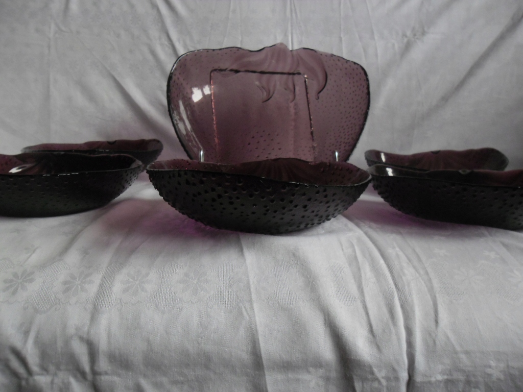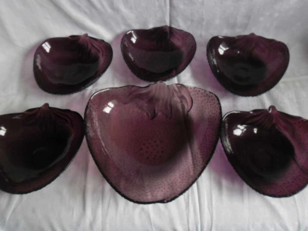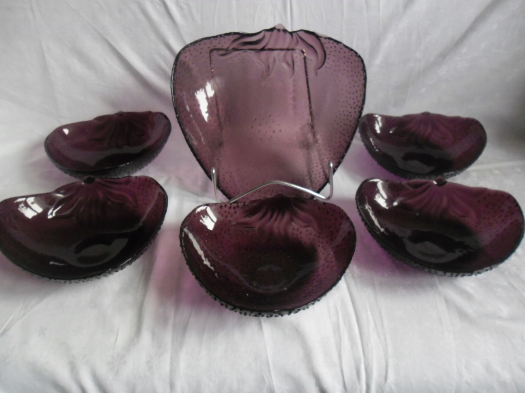 НАБОР СТЕКЛА В ФОРМЕ КЛУБНИКИ ДЛЯ ФРУКТОВЫХ САЛАТОВ И Т. Д. БОЛЬШАЯ ТАРЕЛКА И ПЯТЬ САЛАТНЫХ ЯЩИКОВ ПОМАЛЕНЬКИХ. СОСТОЯНИЕ ХОРОШЕЕ, ЦАРАПИНЫ НОРМАЛЬНОГО ИСПОЛЬЗОВАНИЯ, ВИДИМЫ ДЕТАЛИ СЕРЕДИНИЦЫ 20 ВЕКА. НА Z ФОТО.