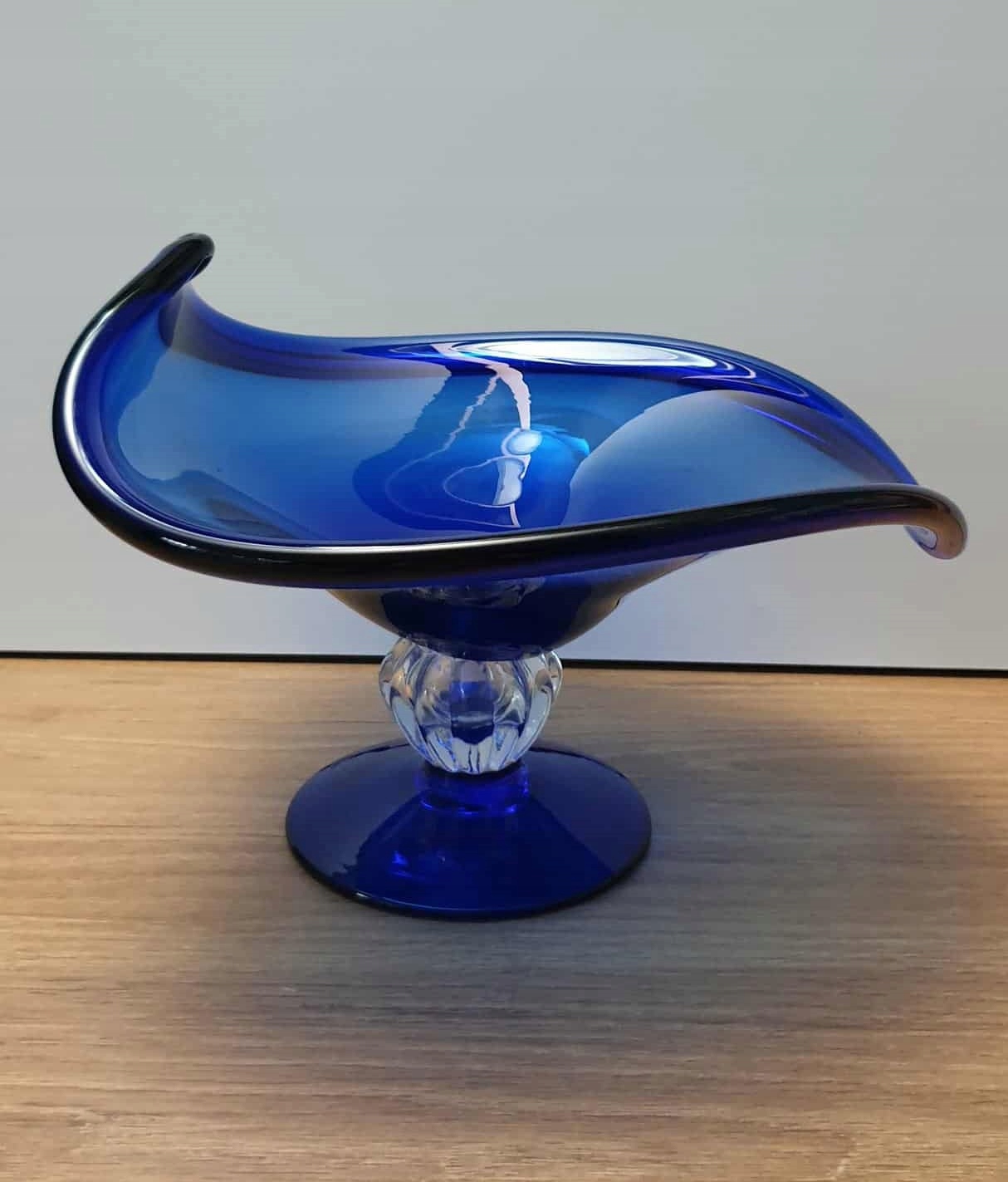 Szklana patera kobaltowa na nodze artystyczne szkło 30x20 cm