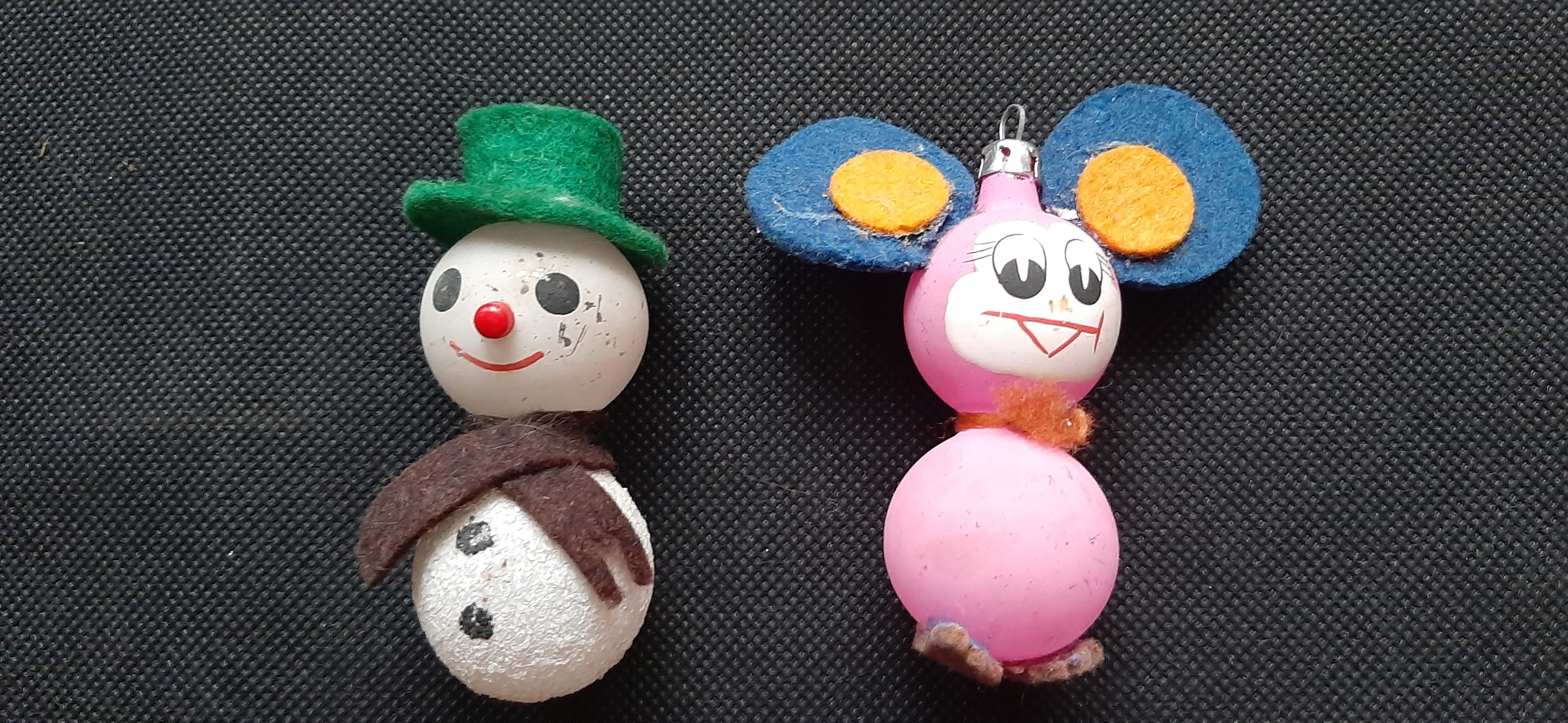 Szklane bombki choinkowe z PRL - Zestaw 2 szt. Bałwanek i Myszka