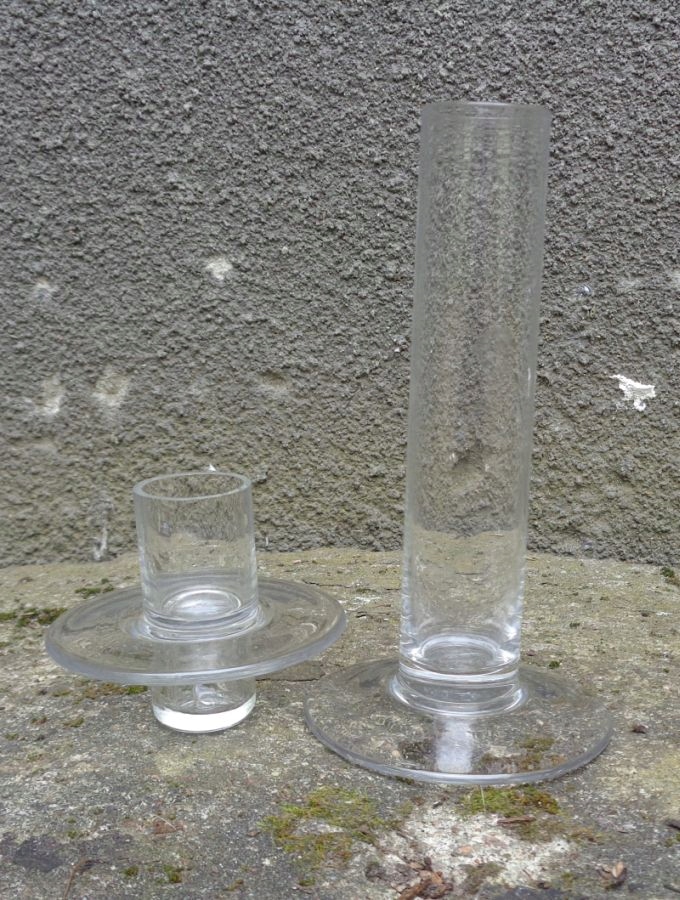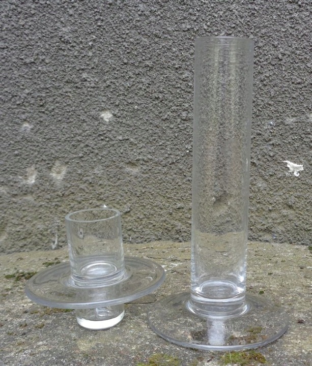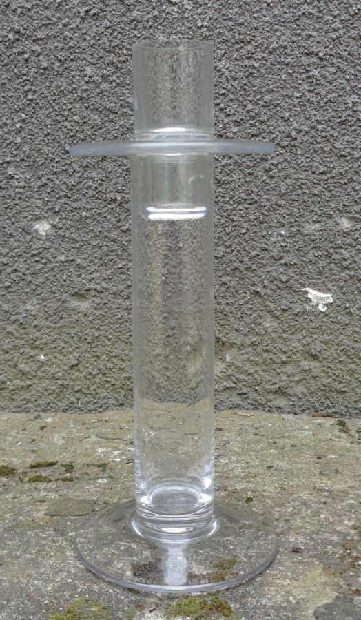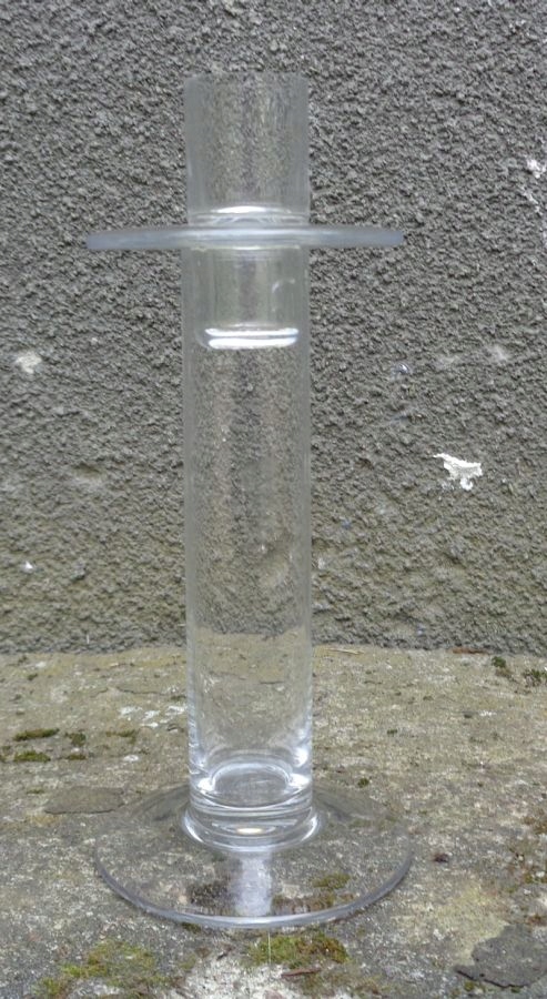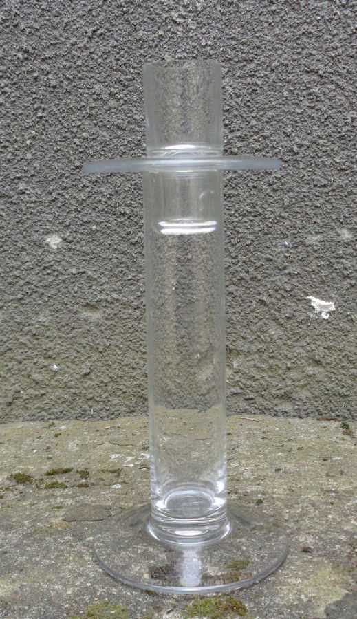Интересный, уникальный стеклянный односвечный подсвечник. Экспонат имеет плоское основание. Ядро экспозиции внутри пусто. Верх экспоната имеет интересный плоский воротник. Верхняя часть подсвечника съемная. Экспонат имеет интересную, простую, классическую форму и форму. Никаких повреждений. Всем рекомендую.