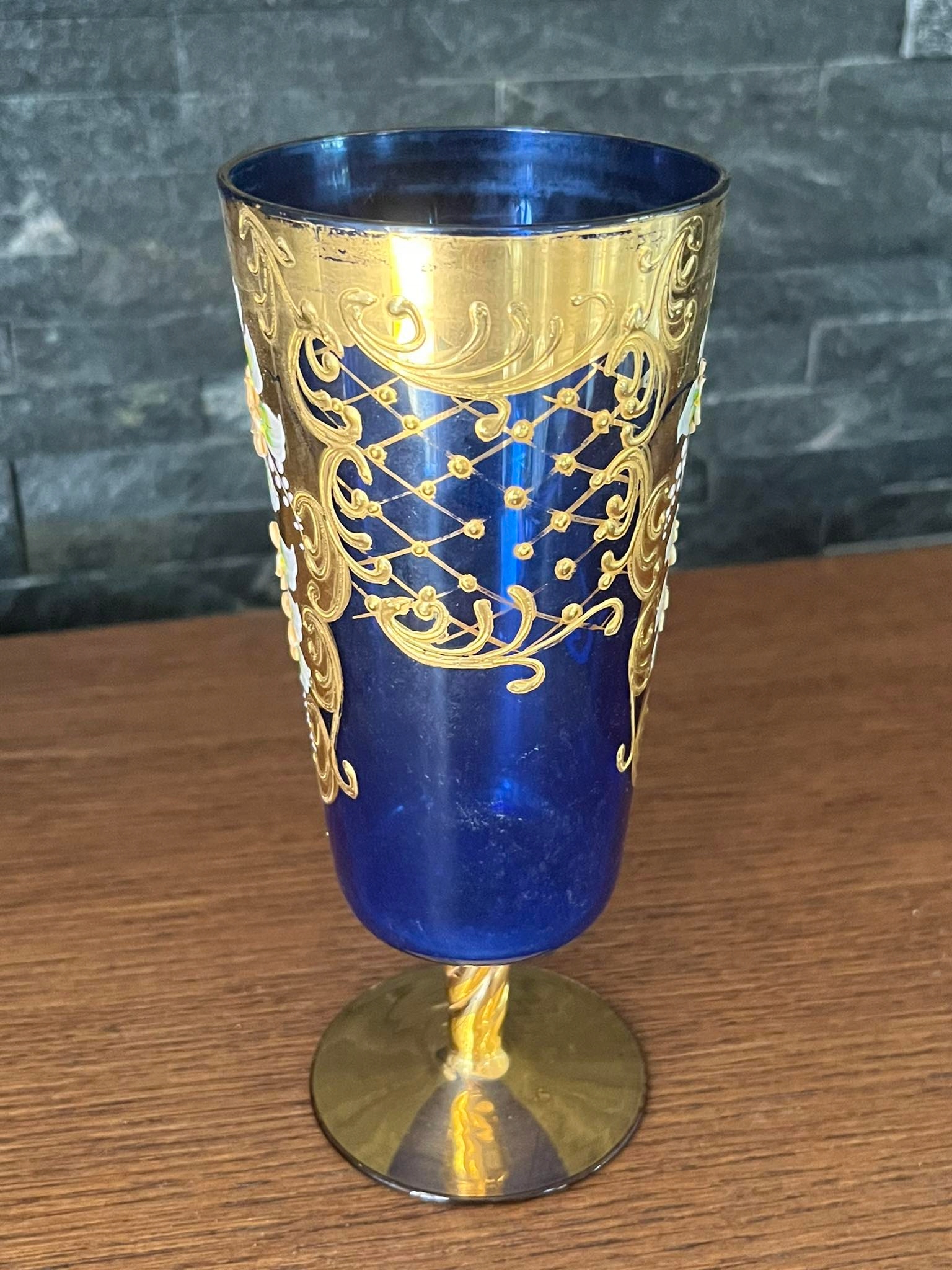 Szklany kielich wazon kobaltowe szkło malowane złotem