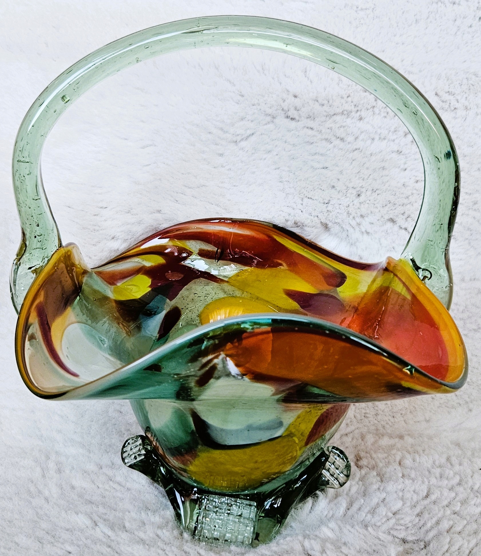 ЦВЕТНАЯ СТЕКЛЯННАЯ КОРЗИНА, АНТИКВАРНОЕ СТЕКЛО РУЧНОЙ ВЫДУВКИ PRL, УНИКАЛЬНО ВИНТАЖНО!!!