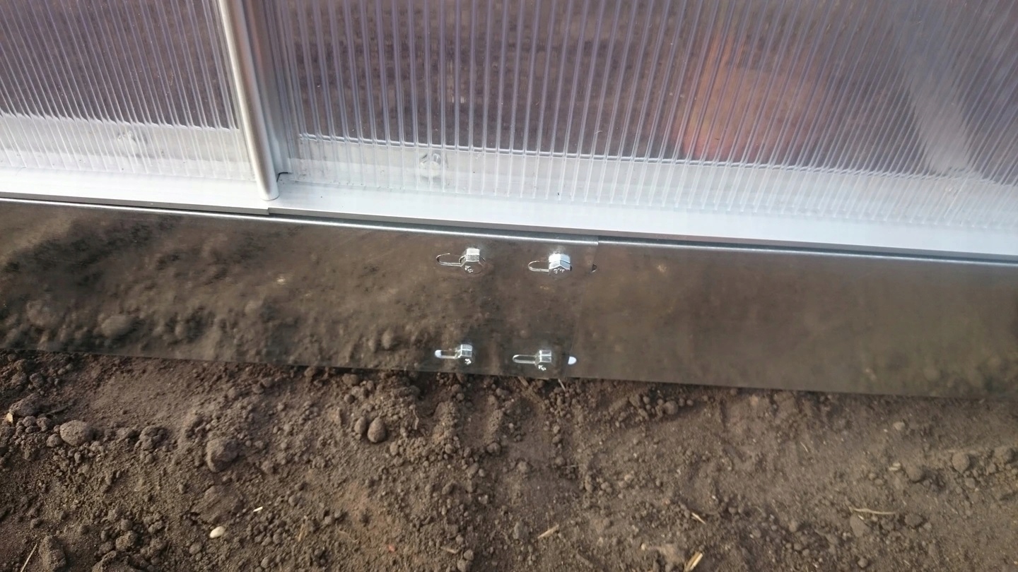 В комплект входит фундамент из оцинкованной стали высотой примерно 11 см, который необходимо закопать в землю, а затем закрепить теплицу с помощью специальных зажимных скоб, входящих в комплект. р>