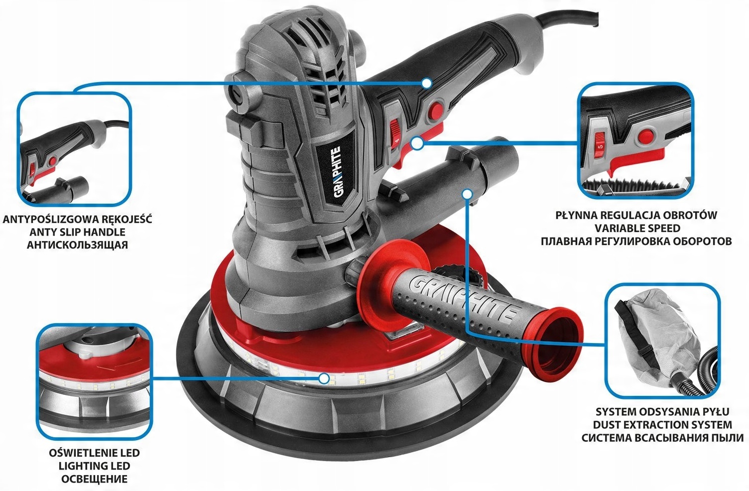 Szlifierka do gipsu 900 W, 180 mm, podświetlenie LED GRAPHITE