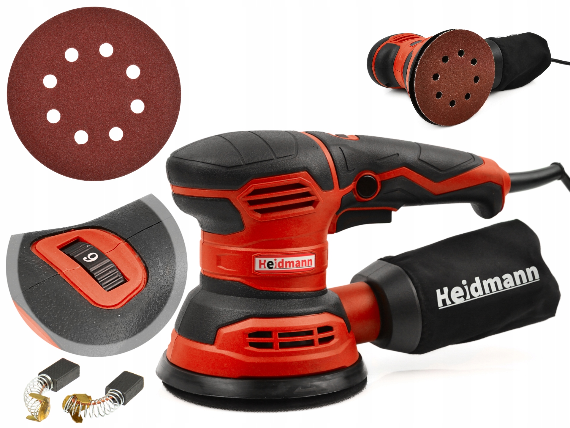 Прибор работает с абразивным материалом диаметром 125 мм с застежкой-липучкой и восемью отверстиями для пылеудаления.