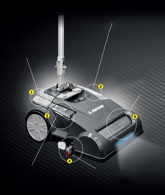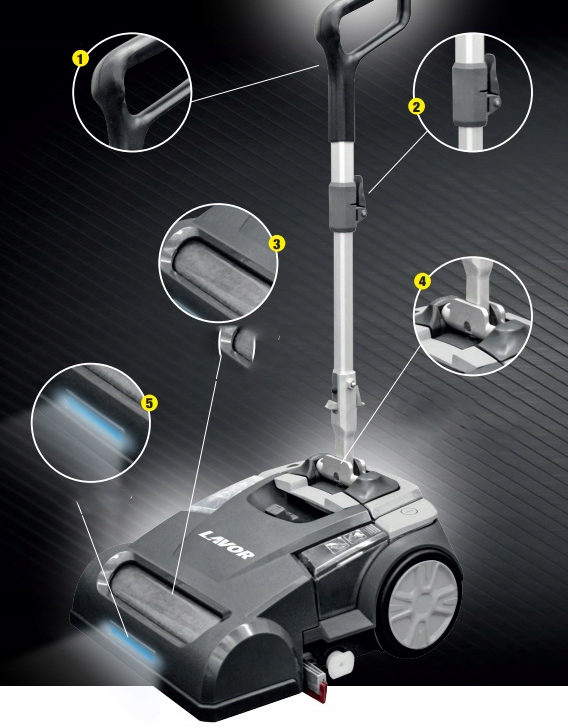 Оснащена съемным резервуаром для раствора и воды, горит передний светодиод. /выключение света и переключатели воды, а также ножные выключатели. Lavor Fit позволяет легко обслуживать, баки и щетки сделаны таким образом, что их легко чистить.