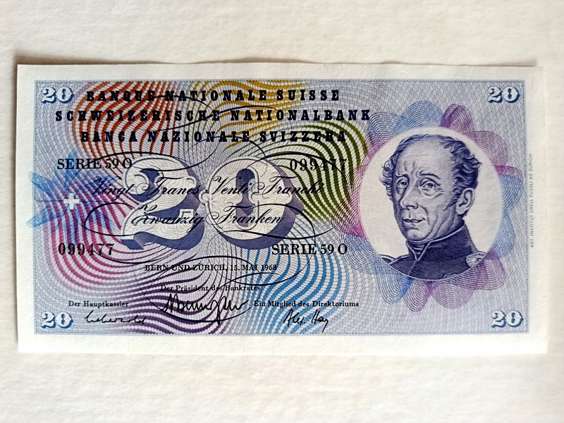 SZWAJCARIA - 20 franków 1968, P- 46p, st. 1/-1, piękny !!!