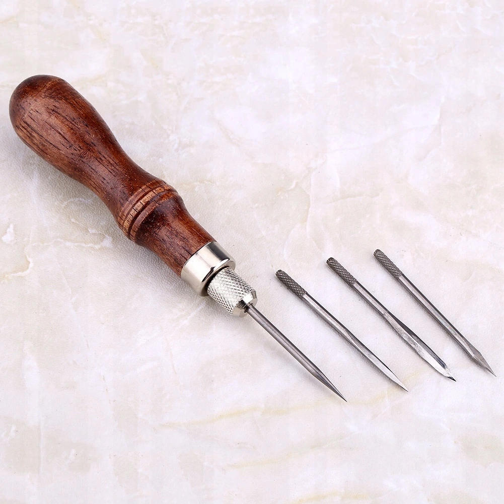 Шило для стирки — практичный инструмент для пробивания отверстий в коже и облегчения шитья. В комплект входит деревянная ручка и 4 головки для вязания крючком, гибкие и удобные в использовании.