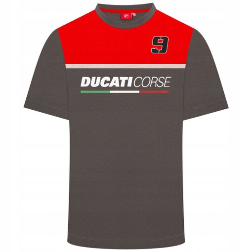 Danilo Petrucci T -Frish из официальной Ducati Dual Collection. Футболка серо-красного хлопка. Спереди и сзади есть логотип Ducati Corse и гоночный номер итальянского водителя Motogp.