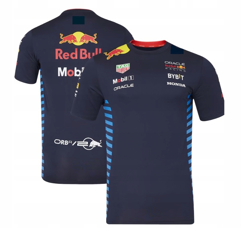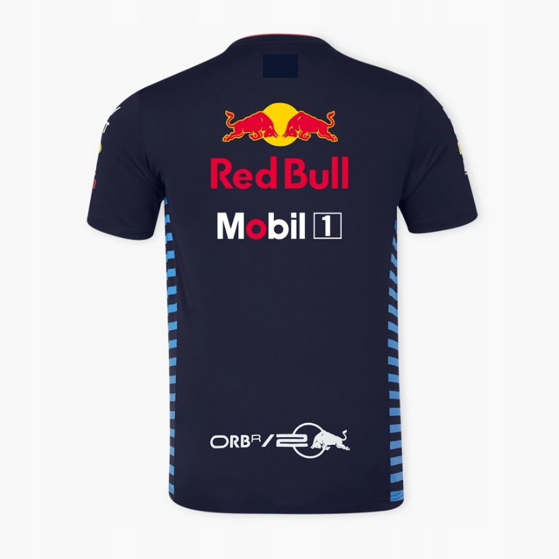 Тема продажи-футболка настройки команды, представляющая цвета команды Oracle Red Bull Racing F1 в 2024 году.