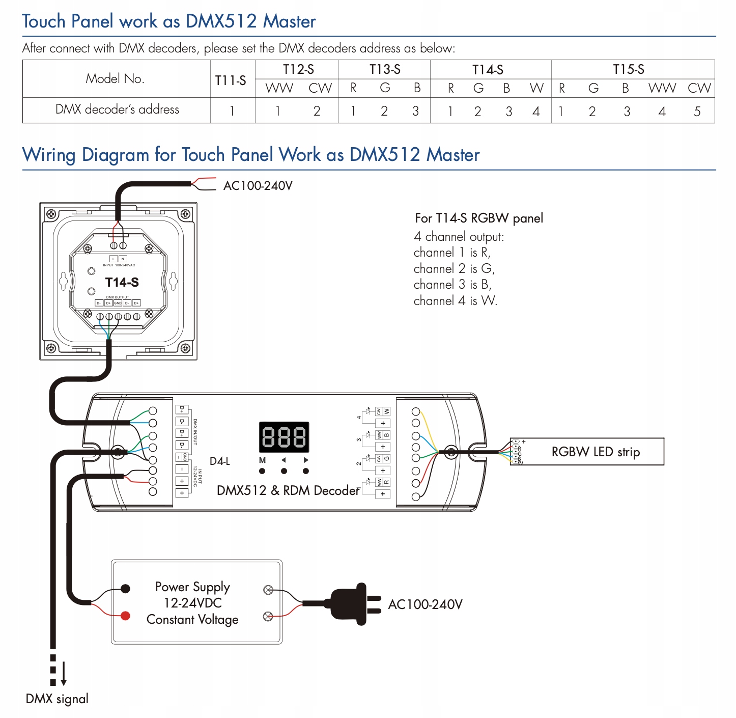 - Панель с сенсорной панелью 1-зоны RGBW DMX512, он также может использоваться в качестве 1-й зоны RGBW RF Pilot rf Протокол DMX512, совместимый с декодерами DMX от любого поставщика