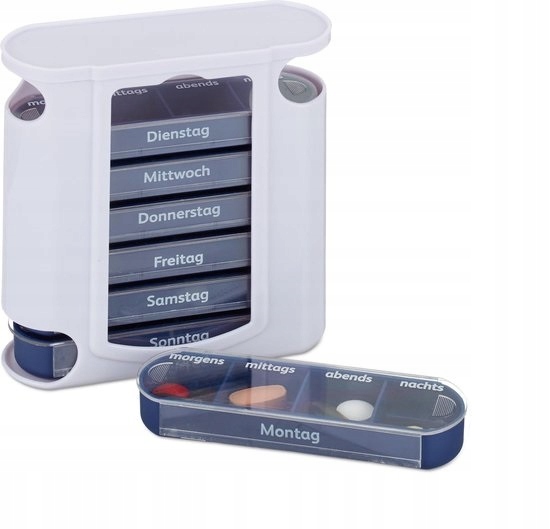 Наш практический организатор планшета облегчит вам лекарство каждый день. Эта медицина состоит из 7 отдельных выдвижных ящиков за каждый день недели. Каждый контейнер имеет 4 отсека с надписями на немецком языке - моргене (утро), Миттагах (в полдень), Абендесами (вечером) и нахами (ночью). Коробки размещены в пластиковом корпусе. Эта таблетка маленькая и удобная, поэтому она отлично подходит для поездок и путешествий. Параметры организатора для таблеток. Общее количество размеров: ок. Полипропилен, ABS - Цвет: белый и синий 5 -кратный контейнер для лекарств в течение каждого дня недели - организованный один на других коробках для лекарств, витаминов и т. Д. не включены в набор