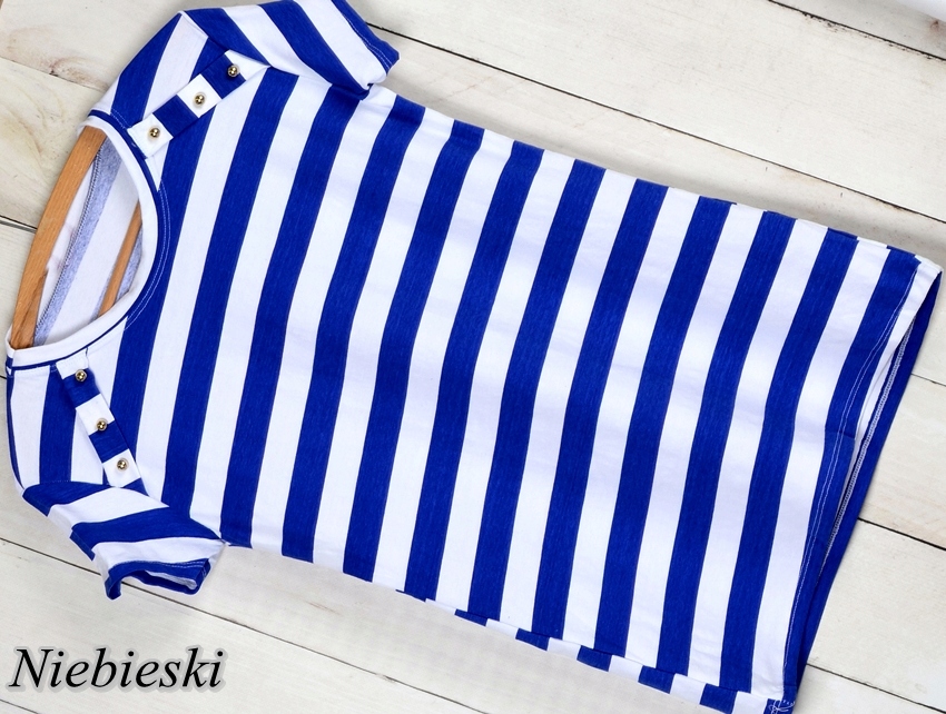 t- рубашка и туника в полоску, украшенная золотыми пуговицами на плечах.
