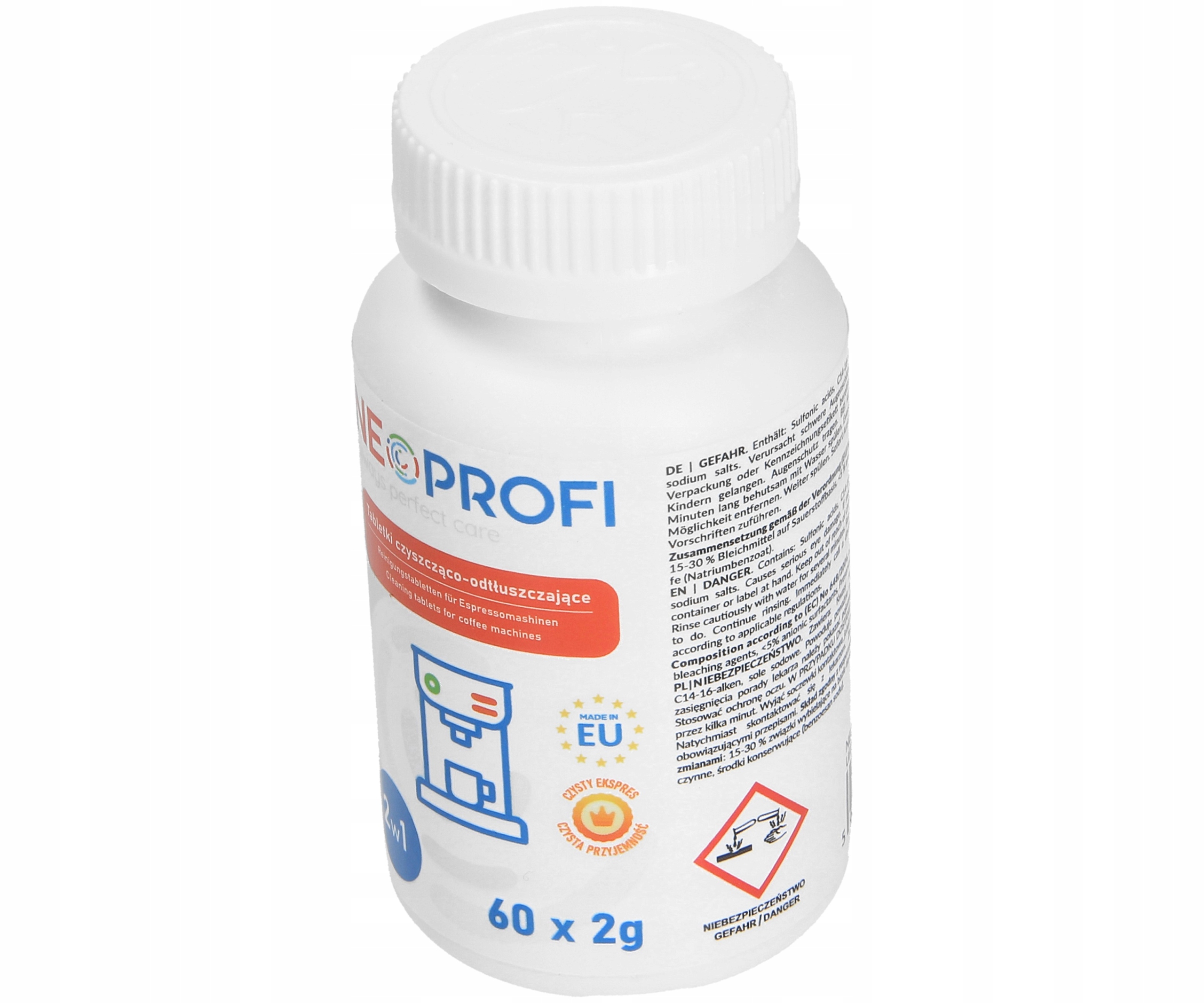 Чистящие таблетки для эспрессо-, капельных кофемашин и кофемашин. Они прекрасно очищают отложения, жир и остатки кофе, находящиеся во внутренних элементах устройства. Использование чистящих таблеток позволяет продлить срок службы кофемашины и ее эффективность. Способ применения: Перед использованием прочтите инструкцию производителя по очистке устройства. Одной таблетки достаточно для одного цикла чистки. Чтобы почистить некоторые модели кофемашин, нужно разбить планшет. Продукт следует хранить только в оригинальной упаковке. Производитель не несет ответственности за ущерб, возникший в результате неправильного использования изделия. Лучше всего использовать его в течение 5 лет со дня производства, указанного на упаковке.