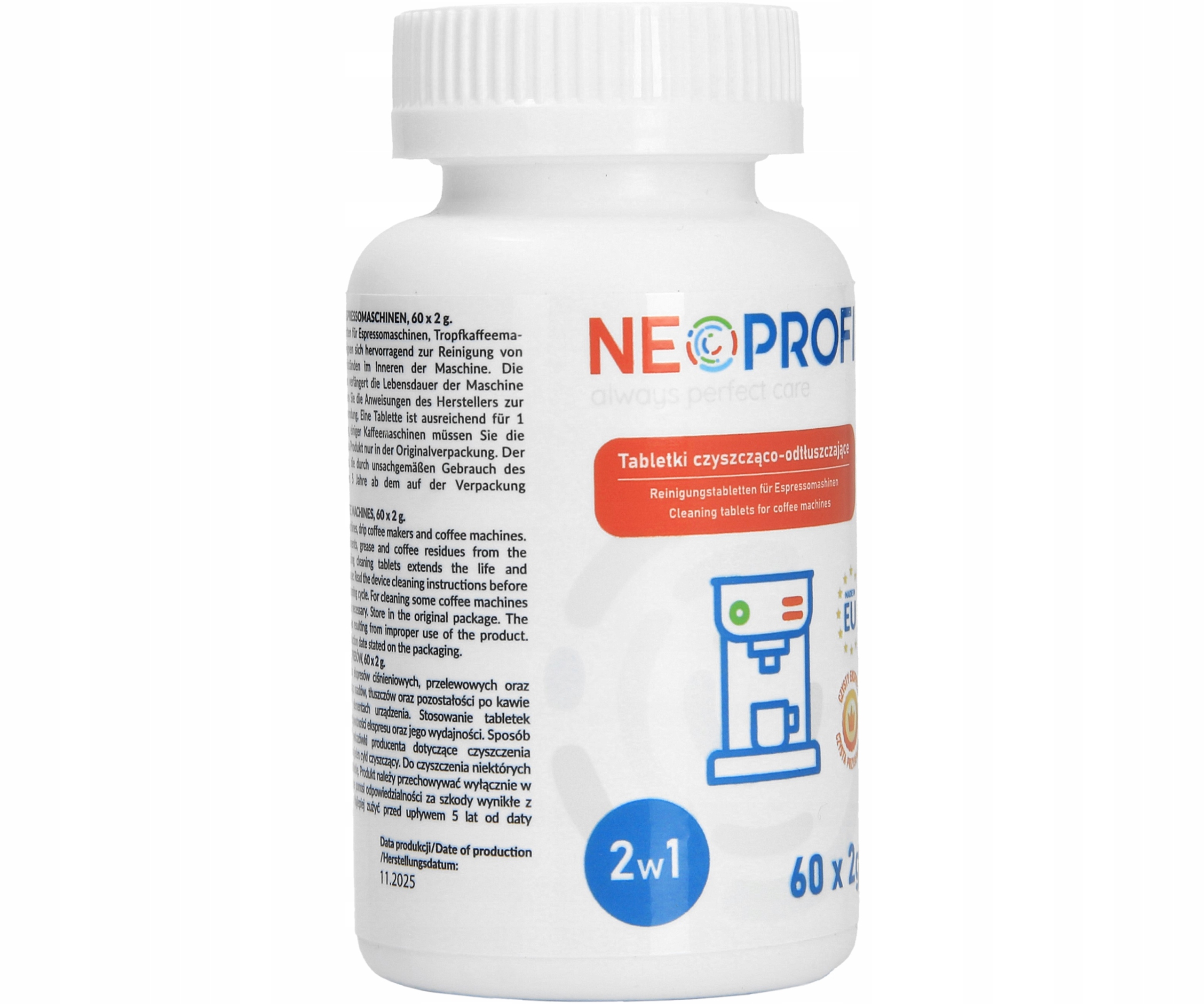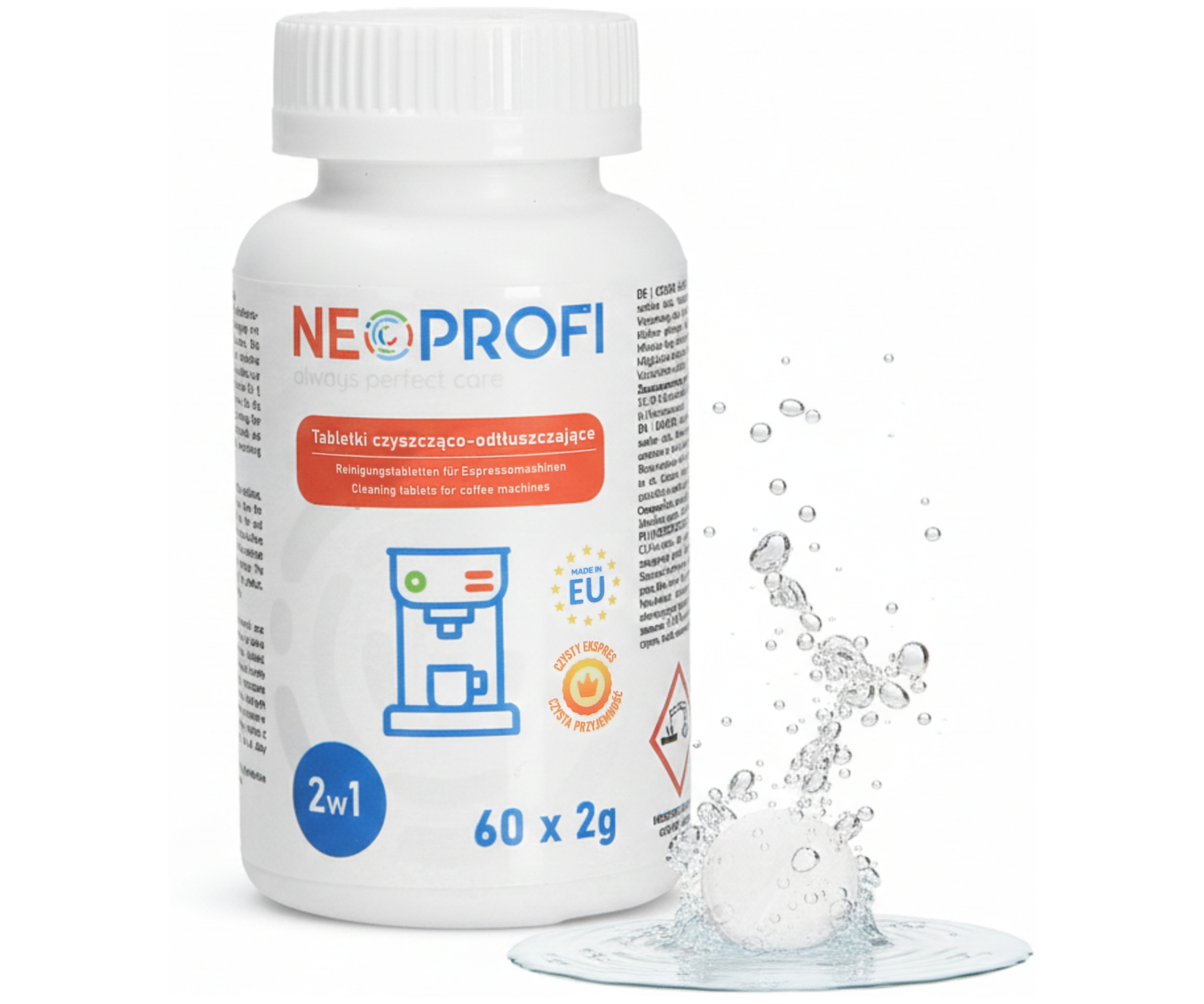 Чистящие таблетки NeoProfi позволяют полностью очистить кофемашину. Таблетки NeoProfi эффективно удаляют известковый налет с компонентов кофемашины. Они устраняют остатки кофе, жира, молока, бактерий и грибков. Они препятствуют отложению жирных загрязнений.
